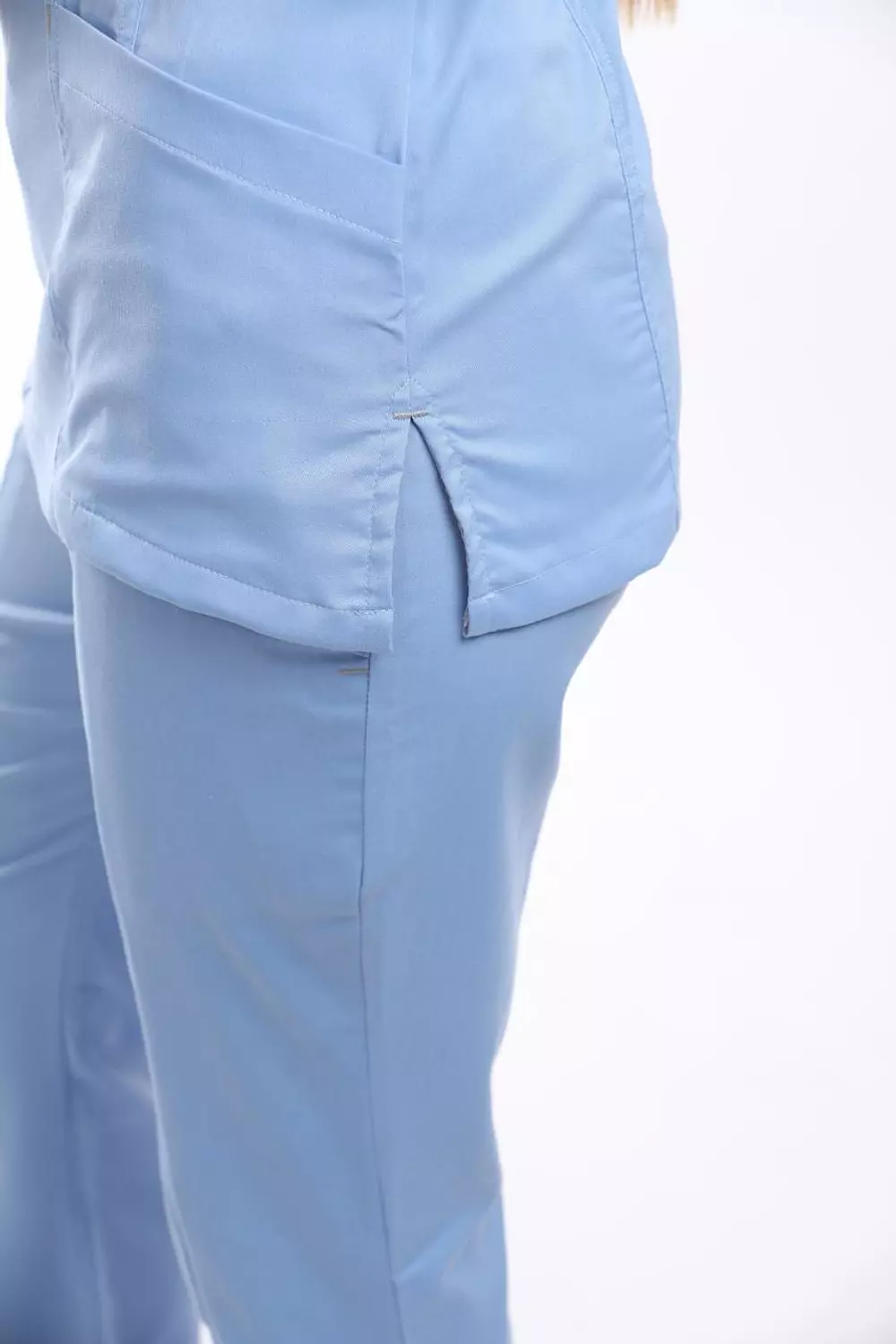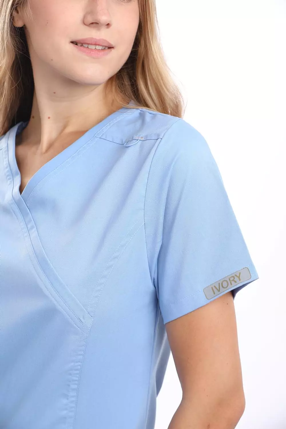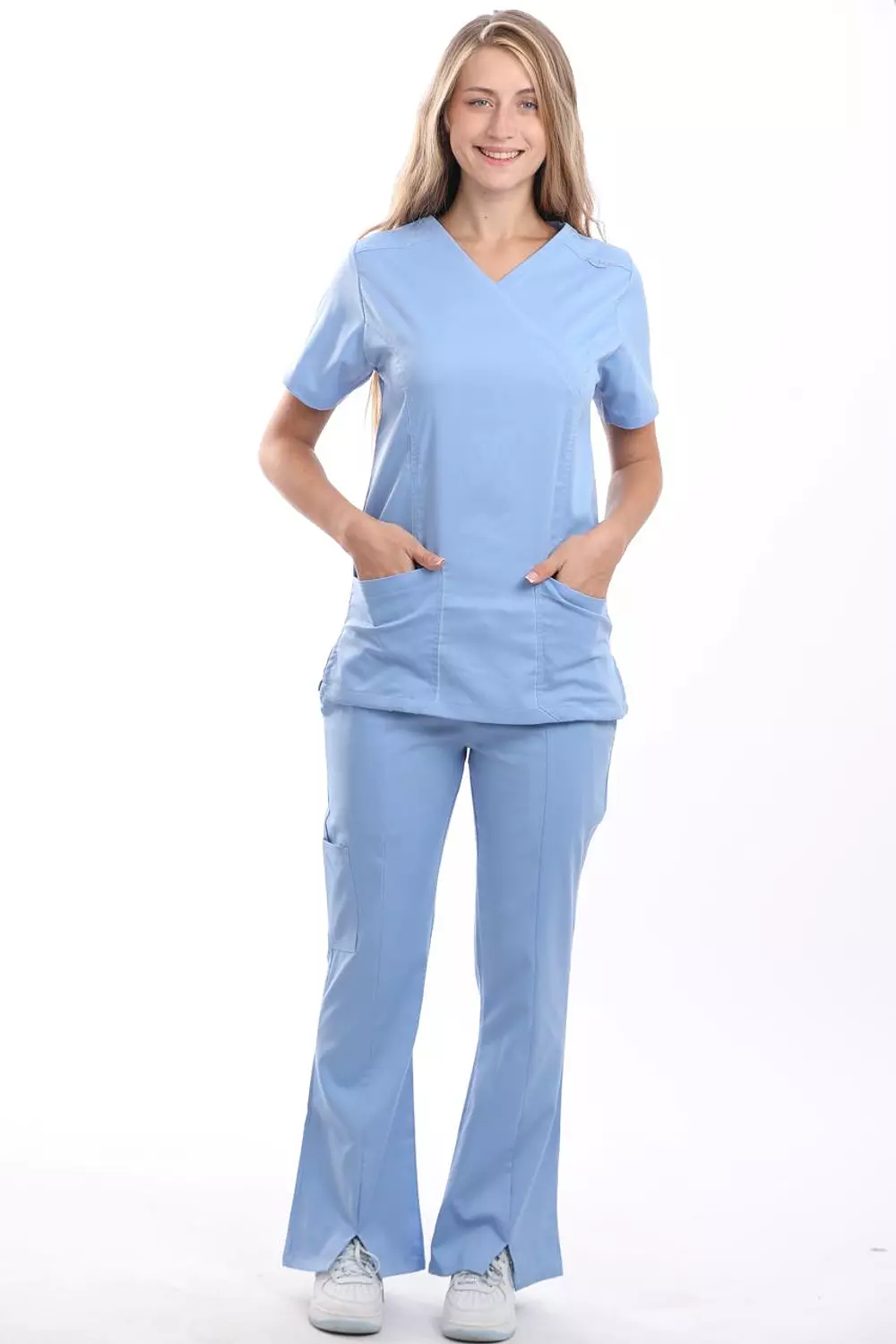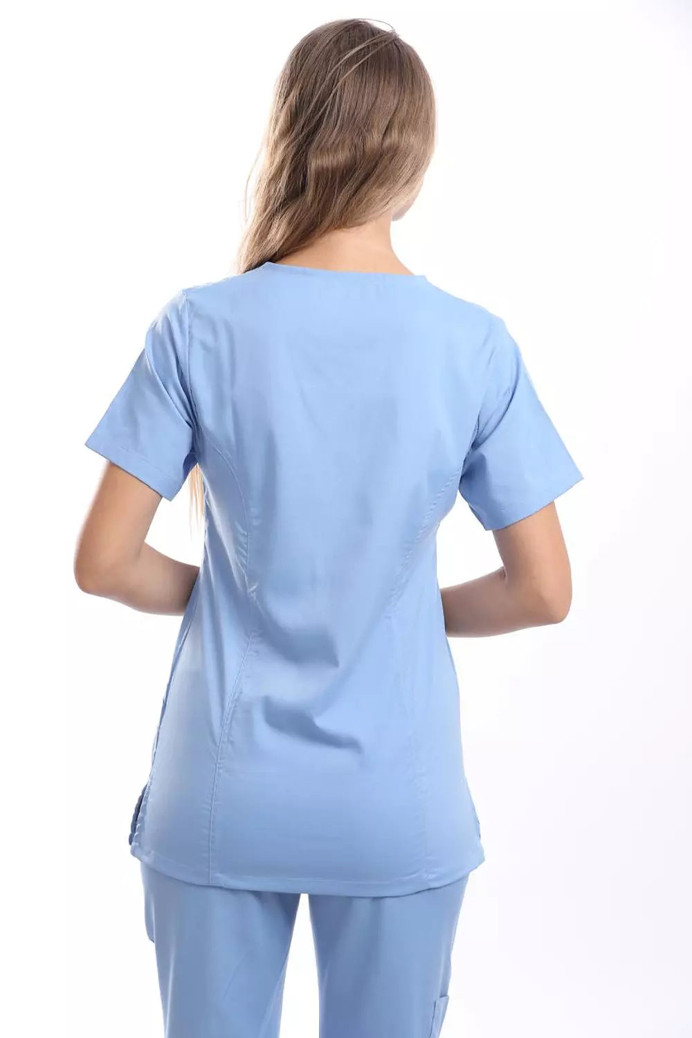 التوب: قميص برقبة على شكل حرف V بأكمام قصيرة، وجيبين أماميين، وفتحات جانبية عند الخصر
