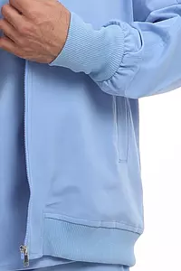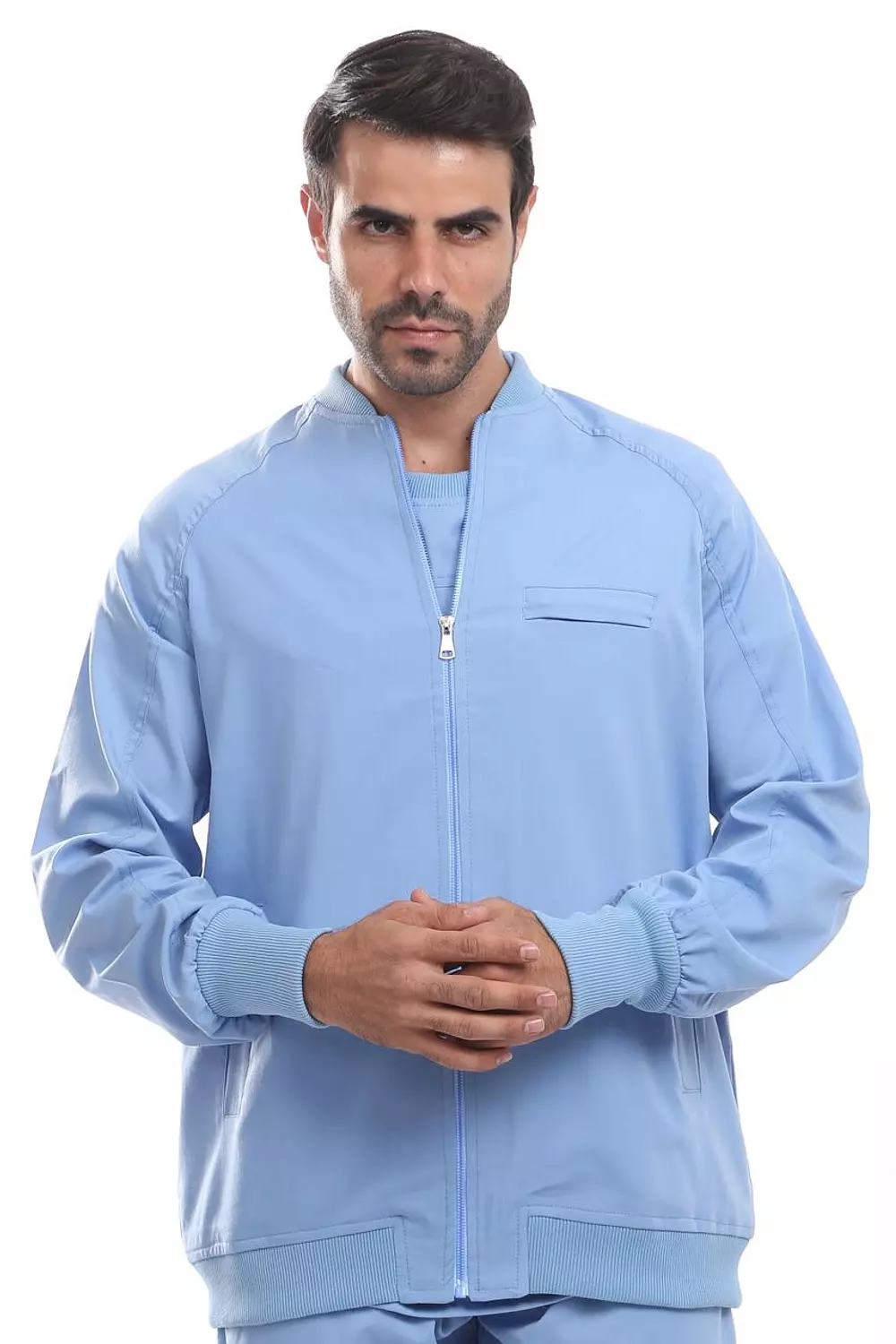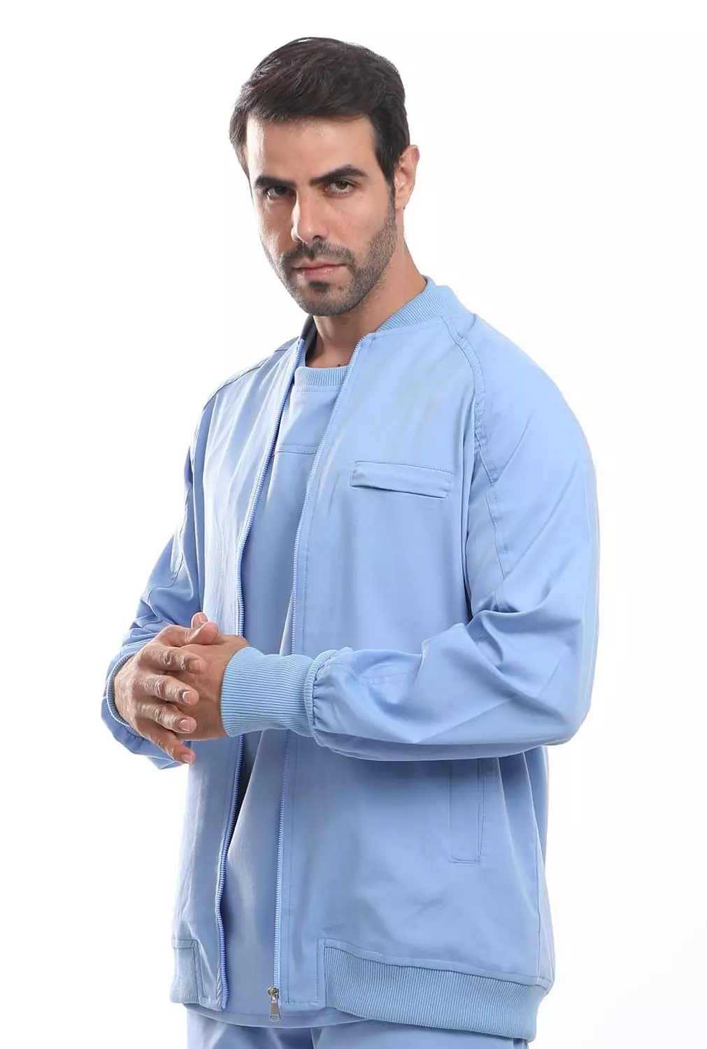 Round Neck jacket featuring a Round Neck, long sleeves, chest front welt pocket, side welt pockets, elastic band wrist, waist elastic band, two invisible inner patch pockets.