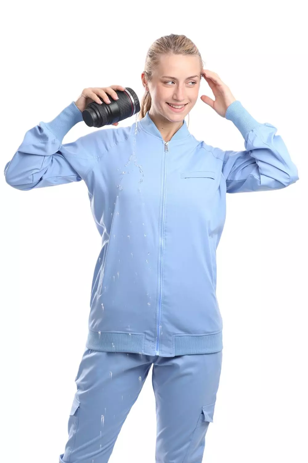 جاكيت برقبة دائرية، تتميز برقبة دائرية، وأكمام طويلة، وجيب أمامي على الصدر، وجيوب جانبية ، ومعصم بشريط مطاطي، وحزام خصر مطاطي، وجيبين داخليين غير مرئيين.