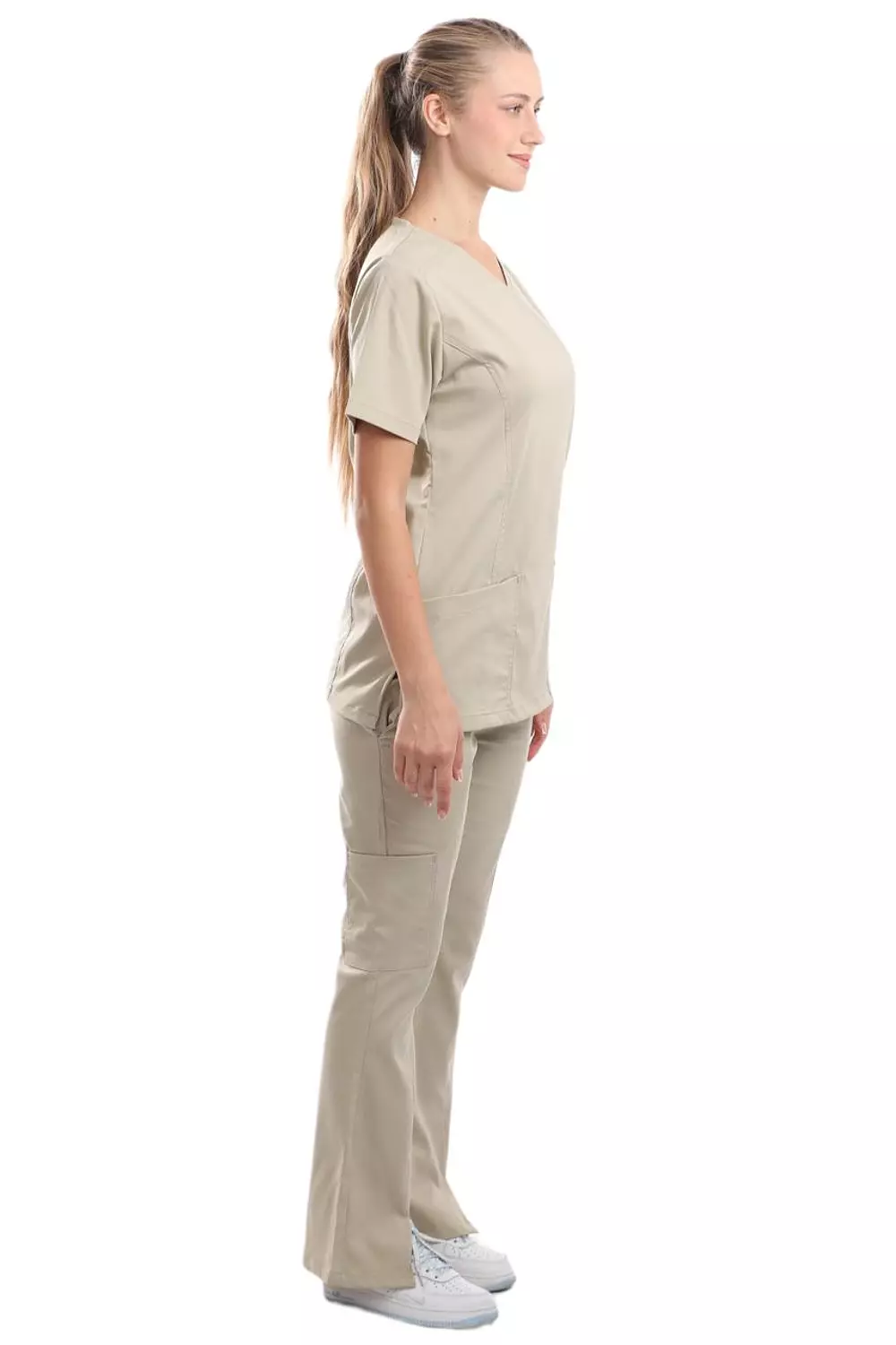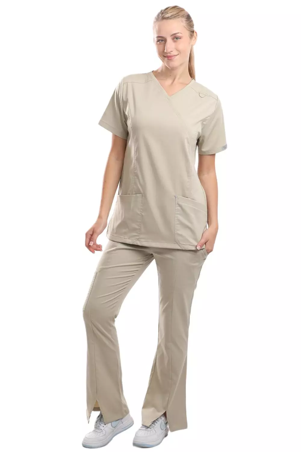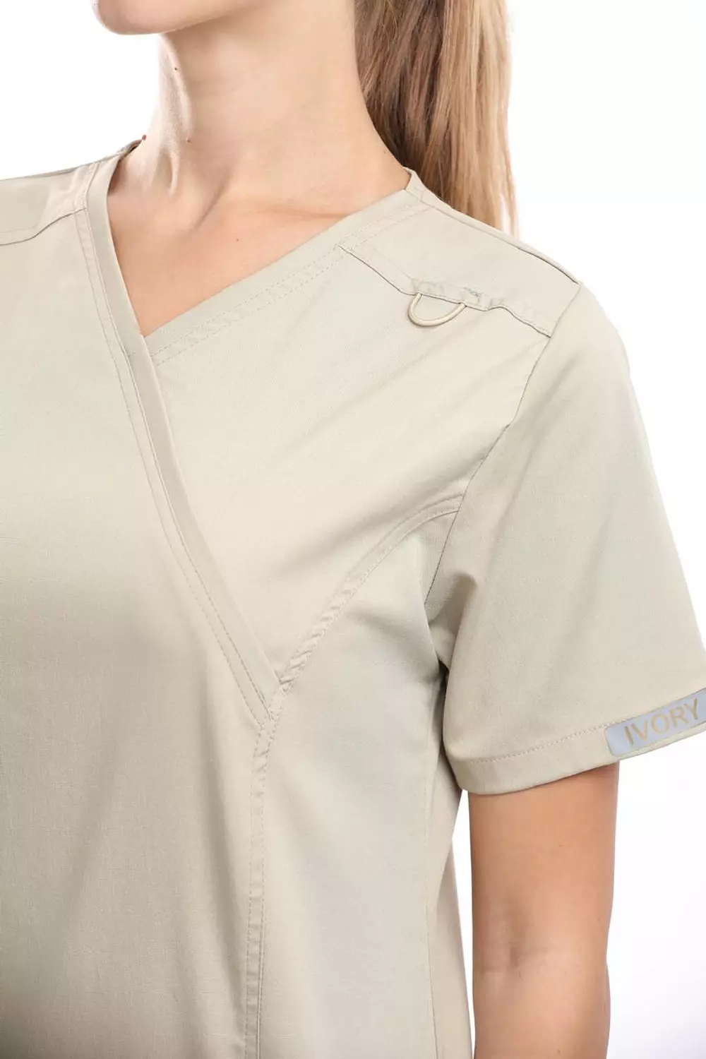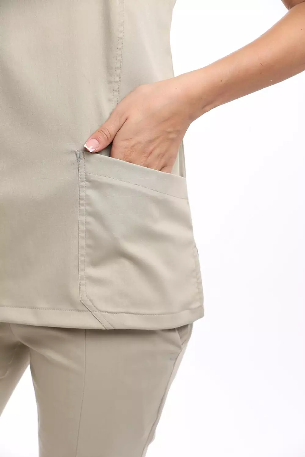 التوب: قميص برقبة على شكل حرف V بأكمام قصيرة، وجيبين أماميين، وفتحات جانبية عند الخصر