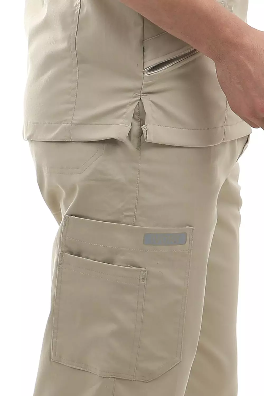 Pants with an elastic waistband and drawstrings. featuring front pockets, rear welt pockets with zippers, side patch pockets.