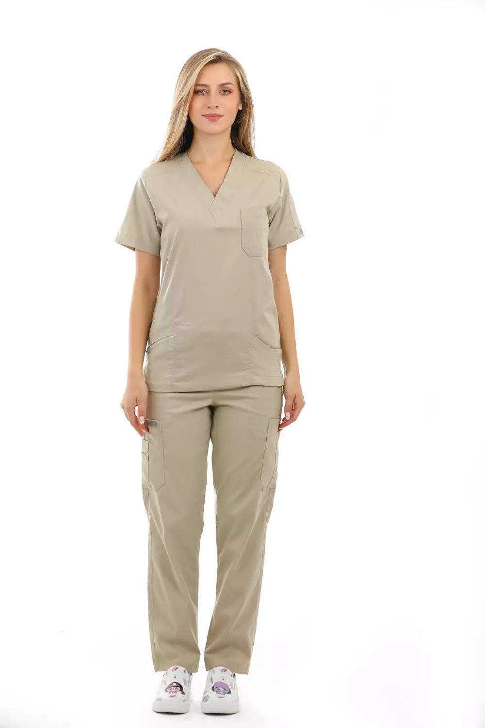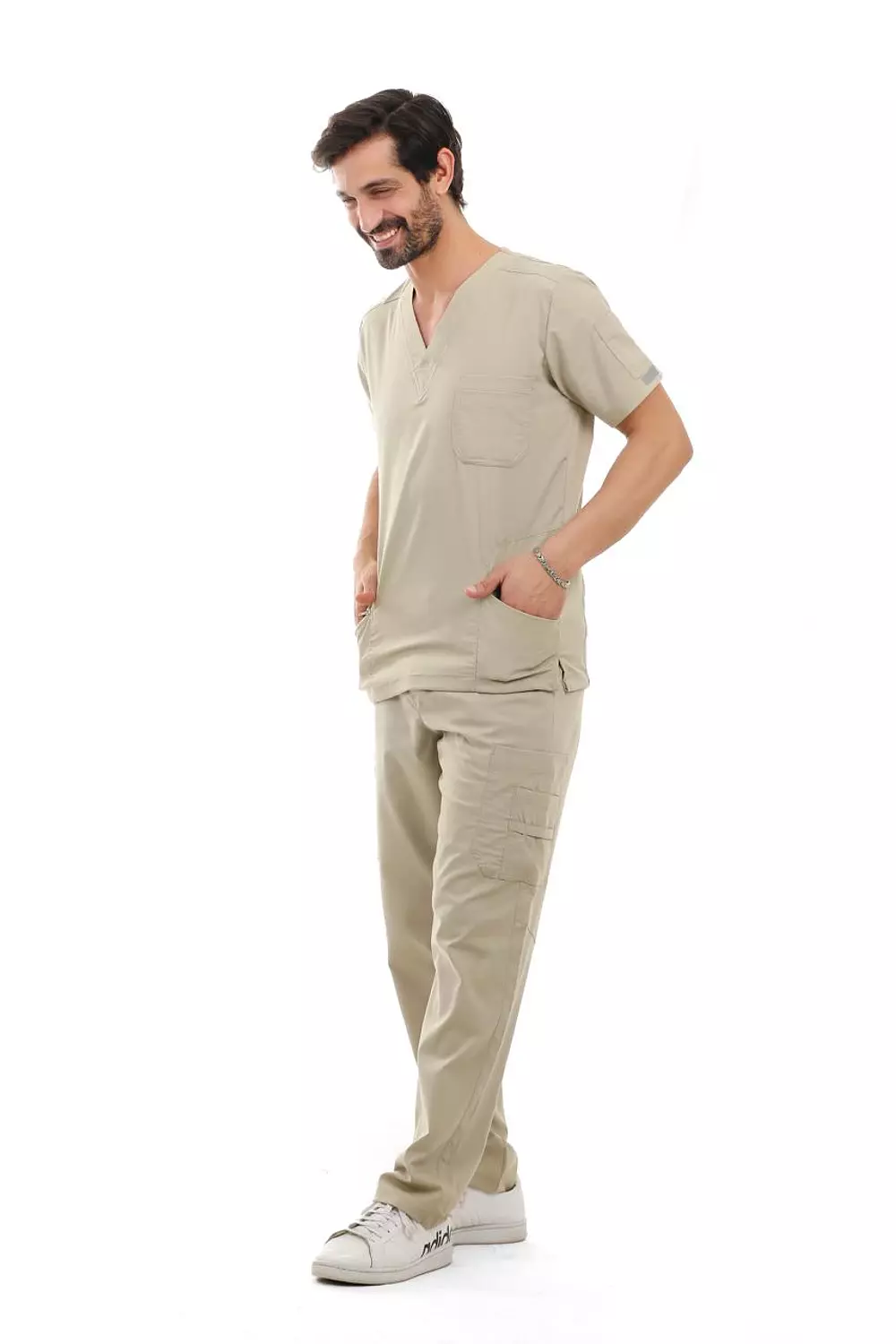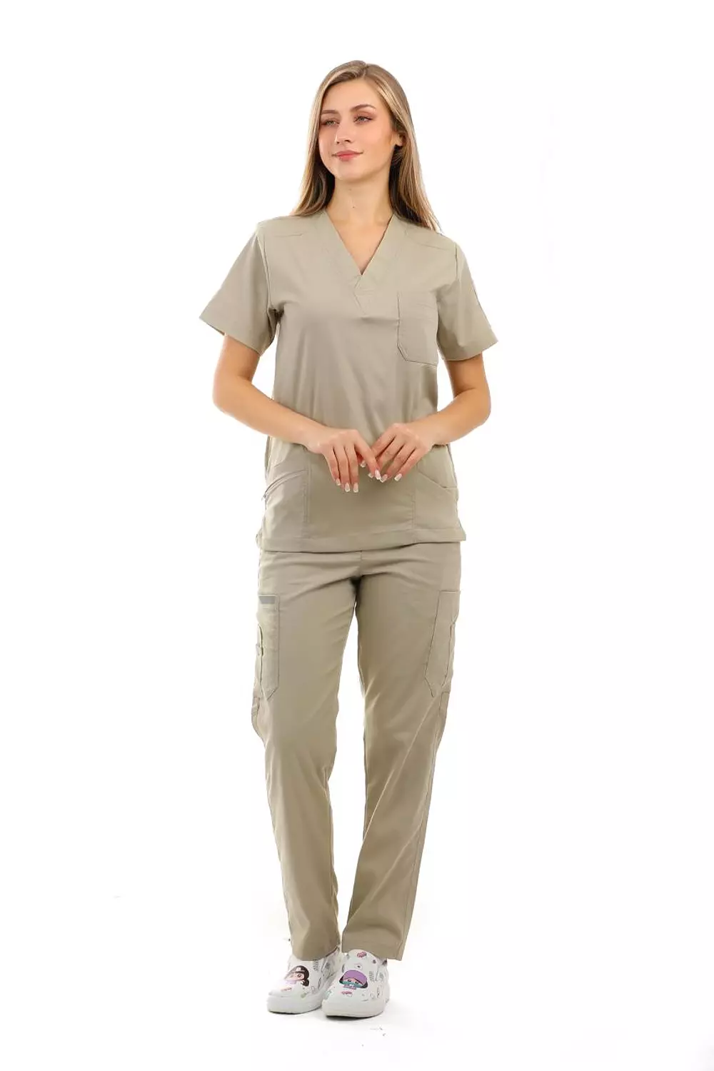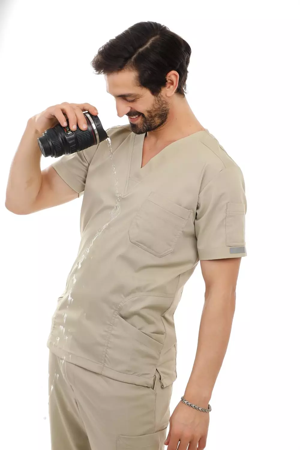 V Neck top featuring a V Neck, short sleeves, front chest welt pocket, front waist welt pockets with zippers, side vents at the hem, shoulder welt pockets.