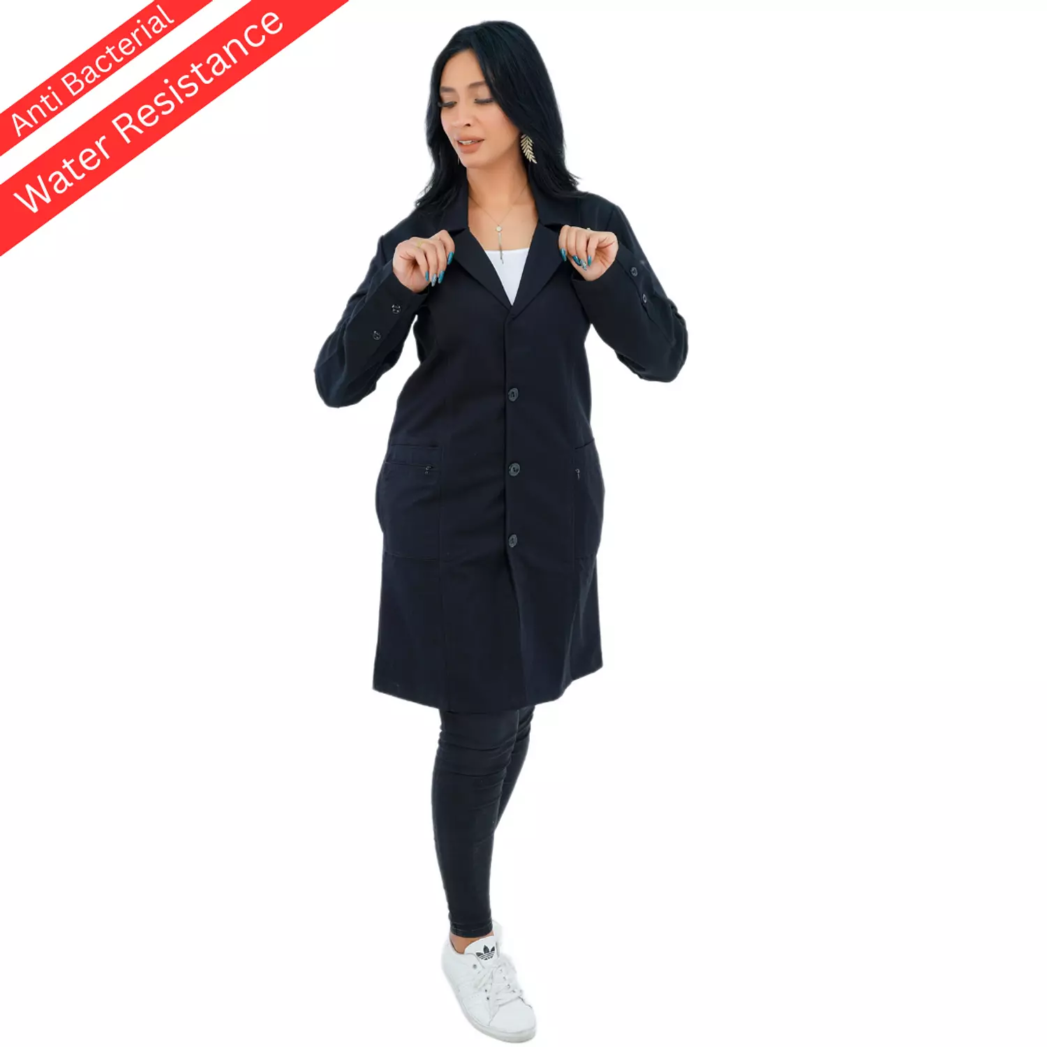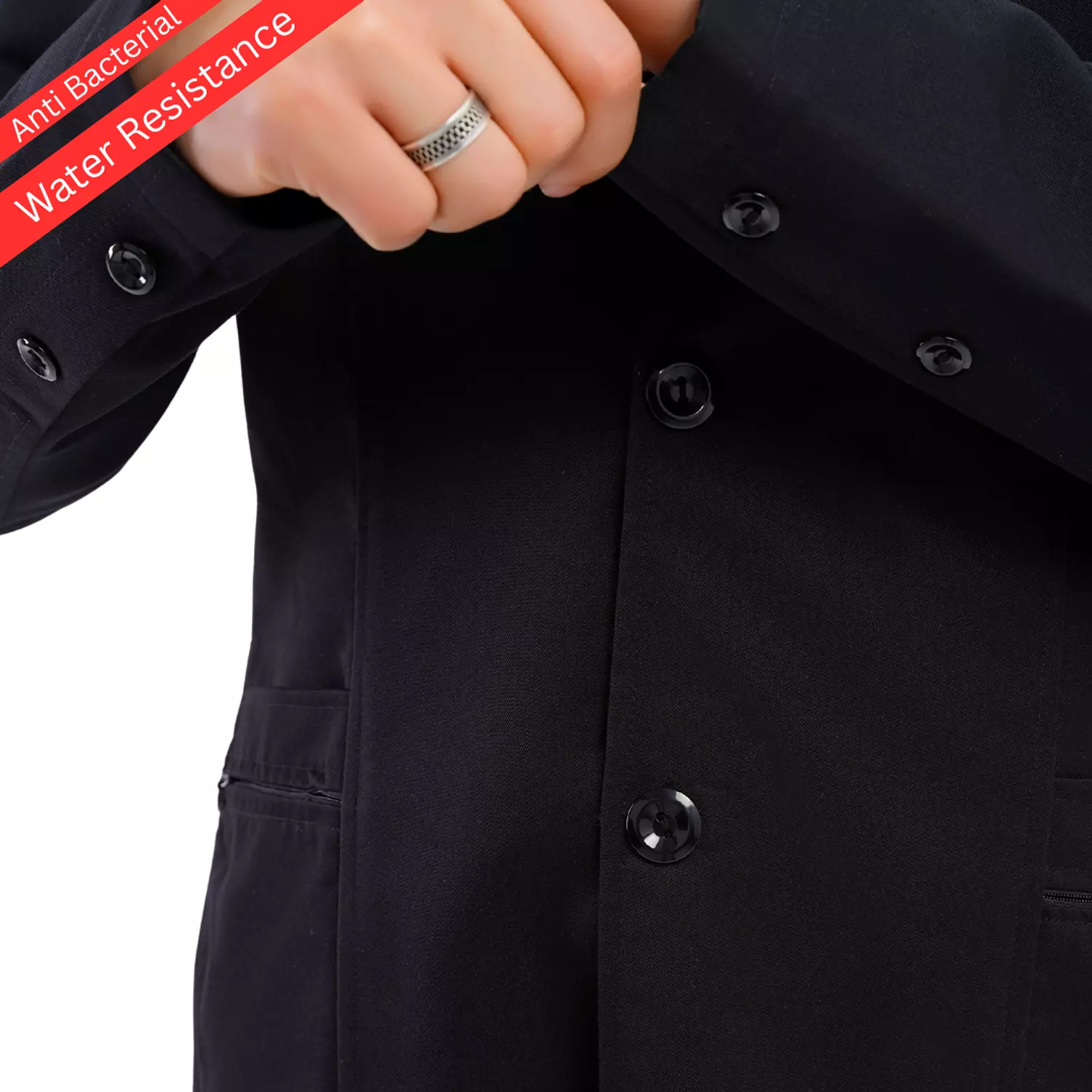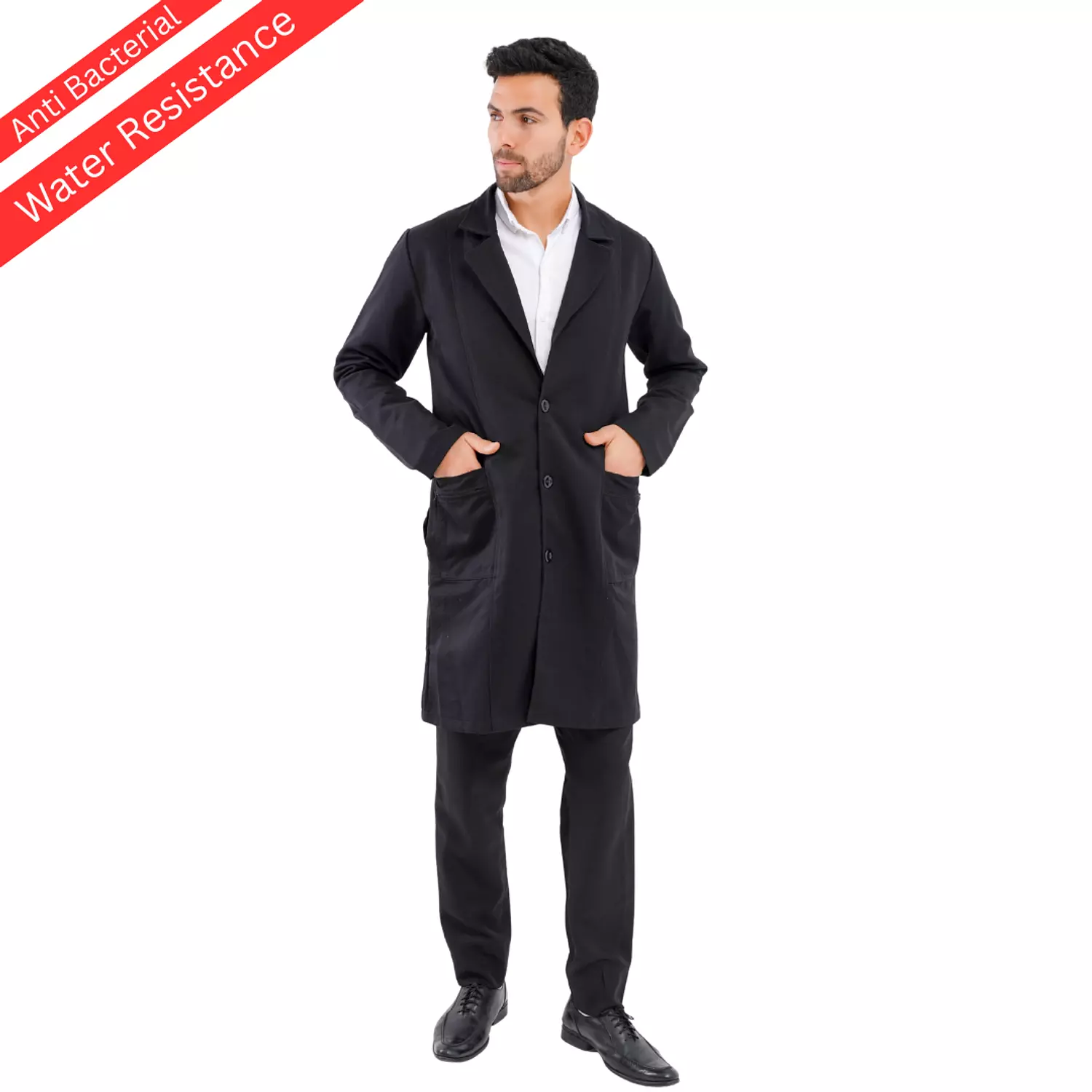 Features: Water Resistance & Anti Bacterial & Anti-Shrinkage & Anti-Wrinkle lab coat featuring Lapel collar, long sleeves, front patch pockets, Invisible inner pockets, side splitting, back vent at the hem