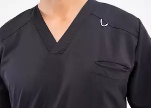 V Neck shirt featuring a V Neck, short sleeves, front welt pocket, side welt pockets, side vents at the hem.