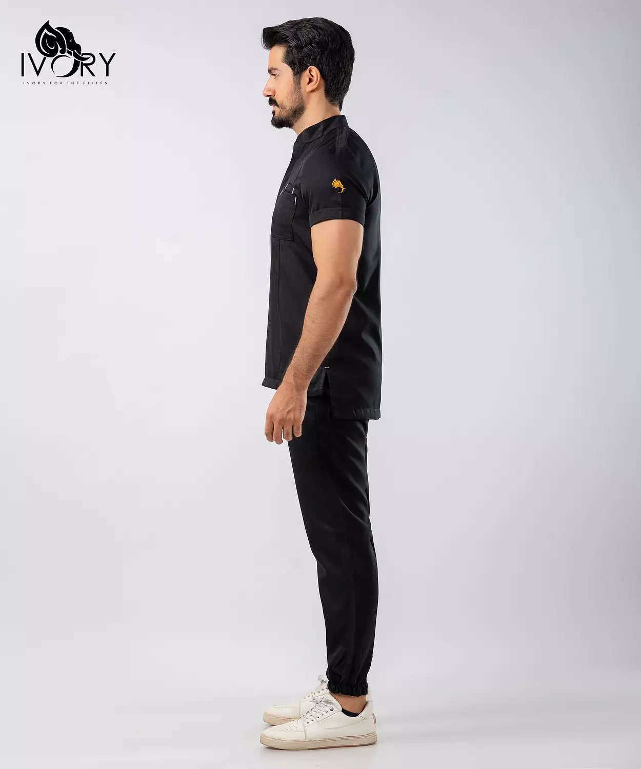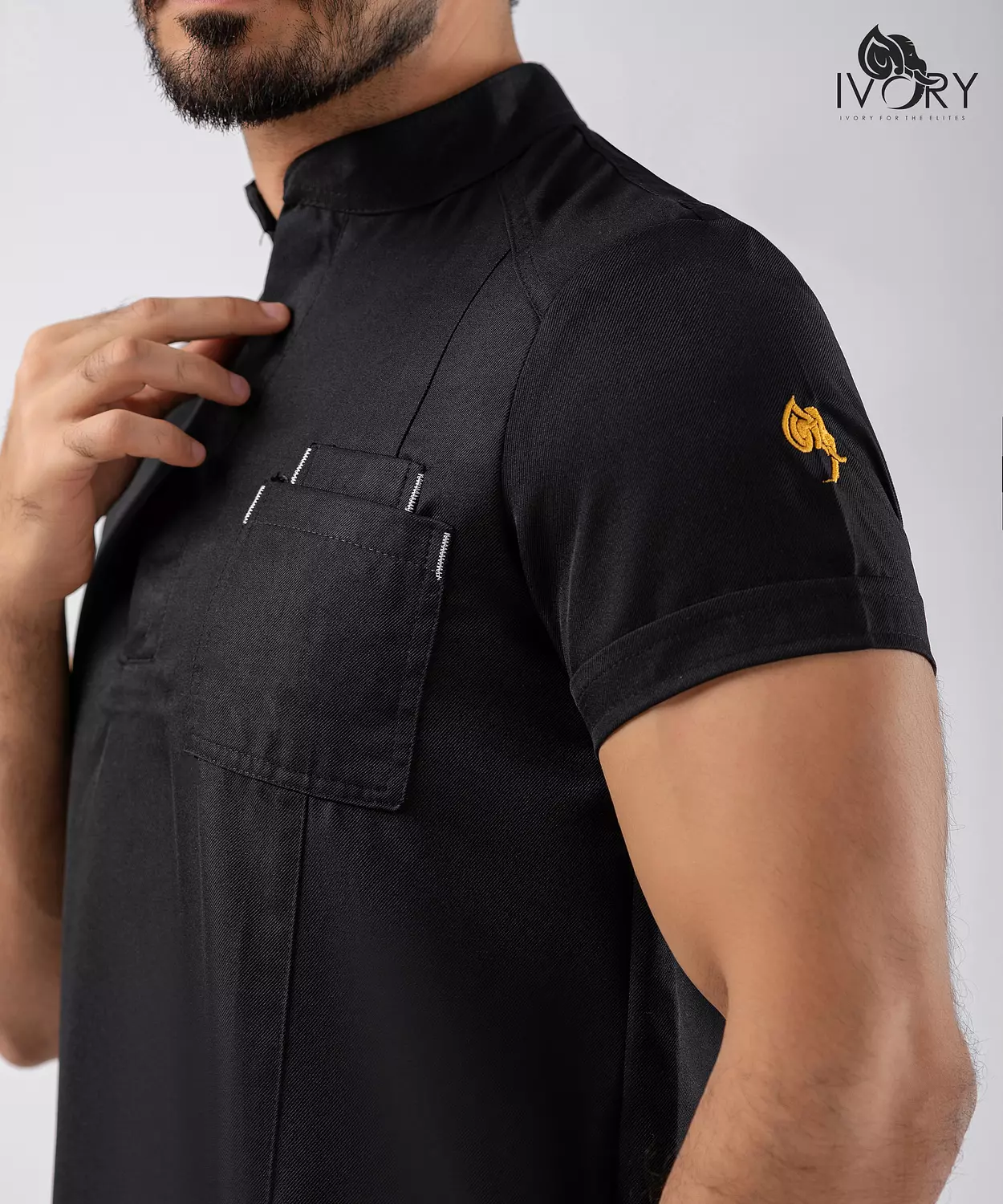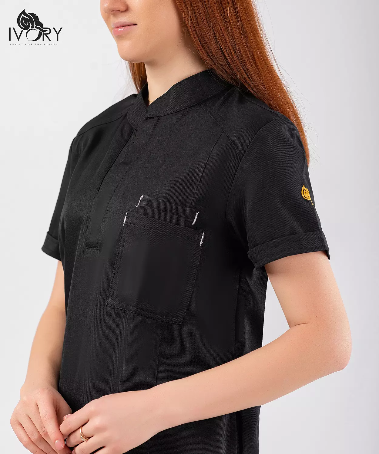 Features: Anti-Shrinkage & Anti-Wrinkle half collar shirt featuring a half collar, short sleeves with ribbed cuffs, front patch pockets, side welt pockets, side vents at the hem and front invisible button fastening.