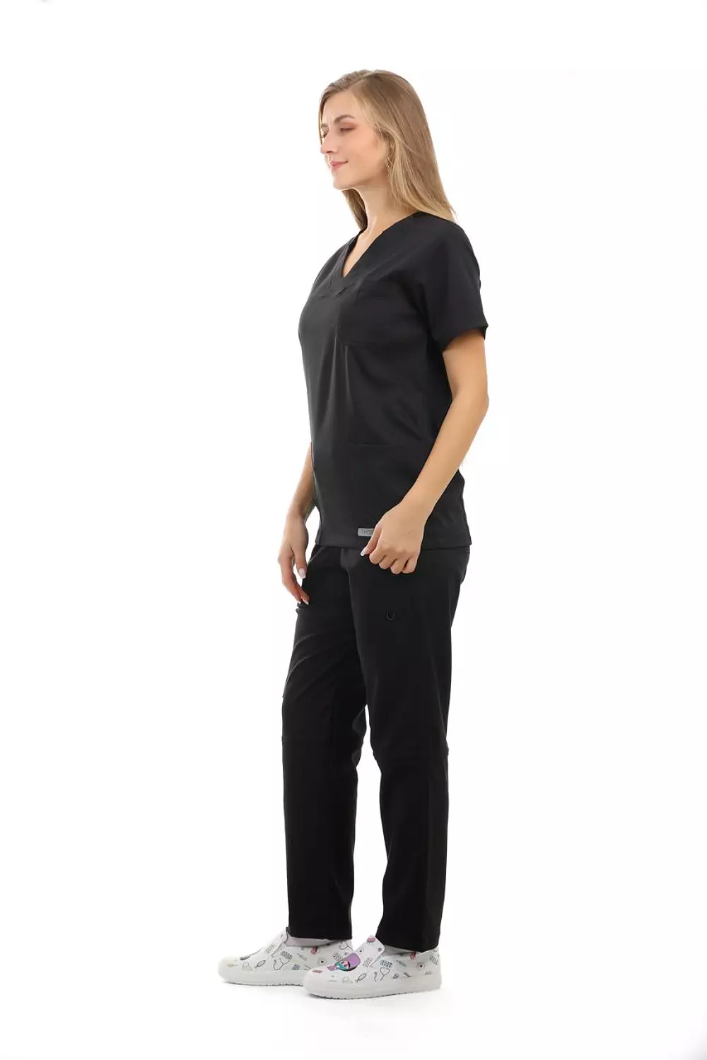 القميص: قميص برقبة على شكل حرف V، يتميز برقبة على شكل حرف V، وأكمام قصيرة، وجيب أمامي على الصدر، وجيوب أمامية على الخصر.