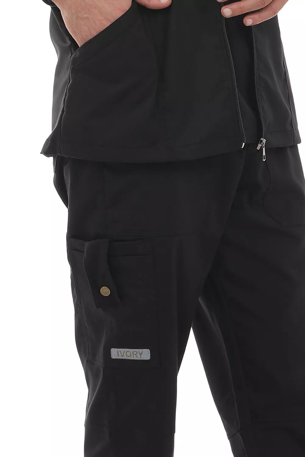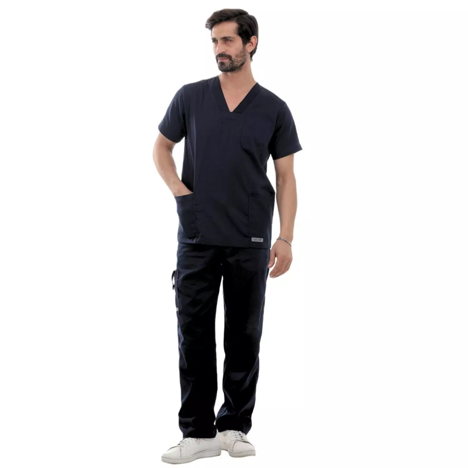 Top: V Neck shirt featuring a V Neck, short sleeves, front chest patch pocket, front waist patch pockets.