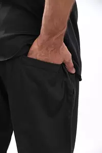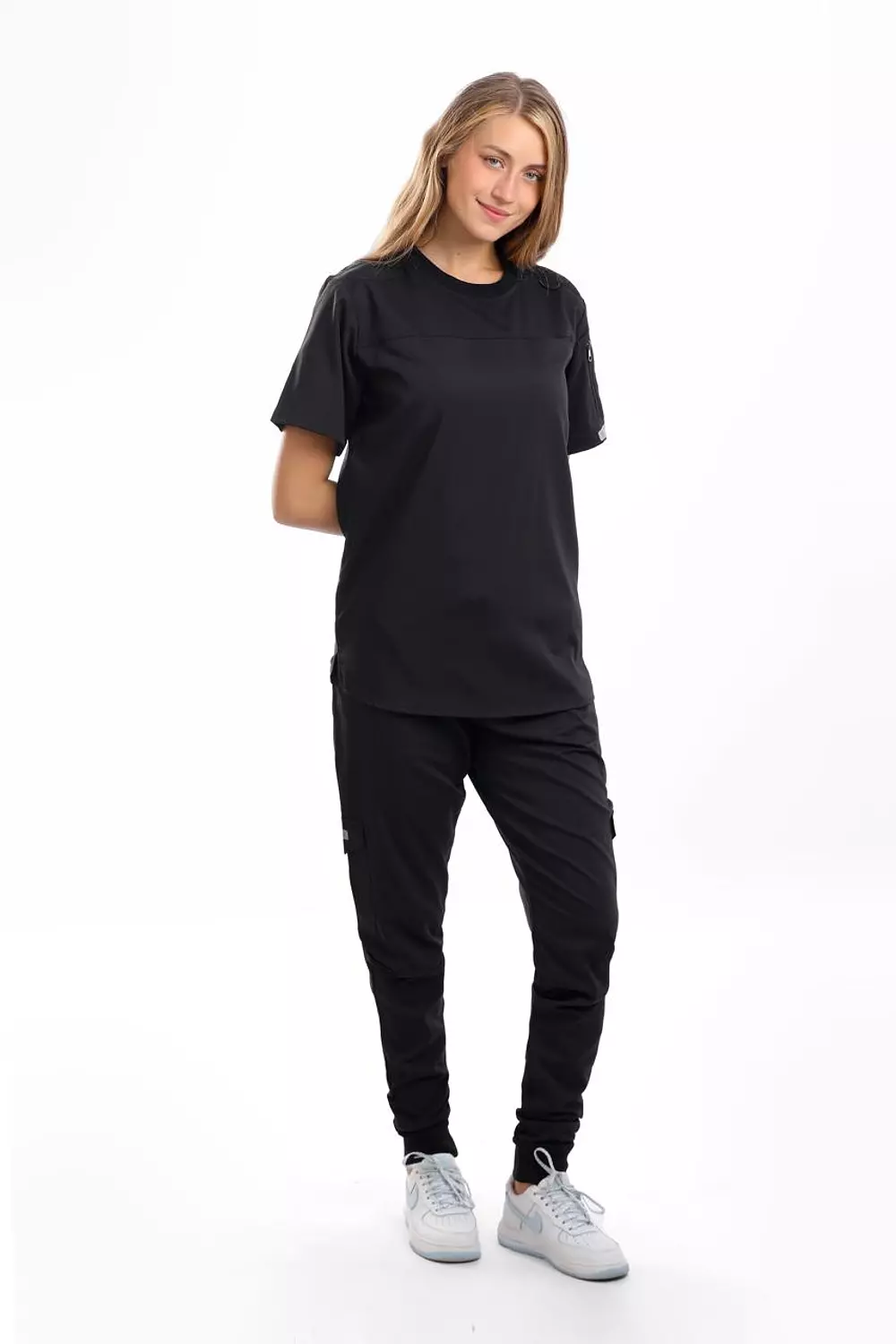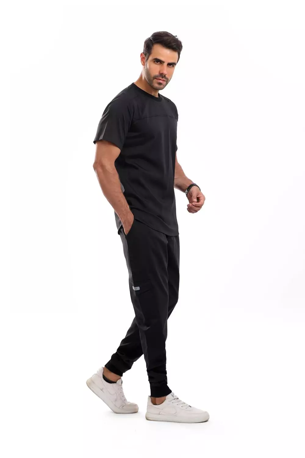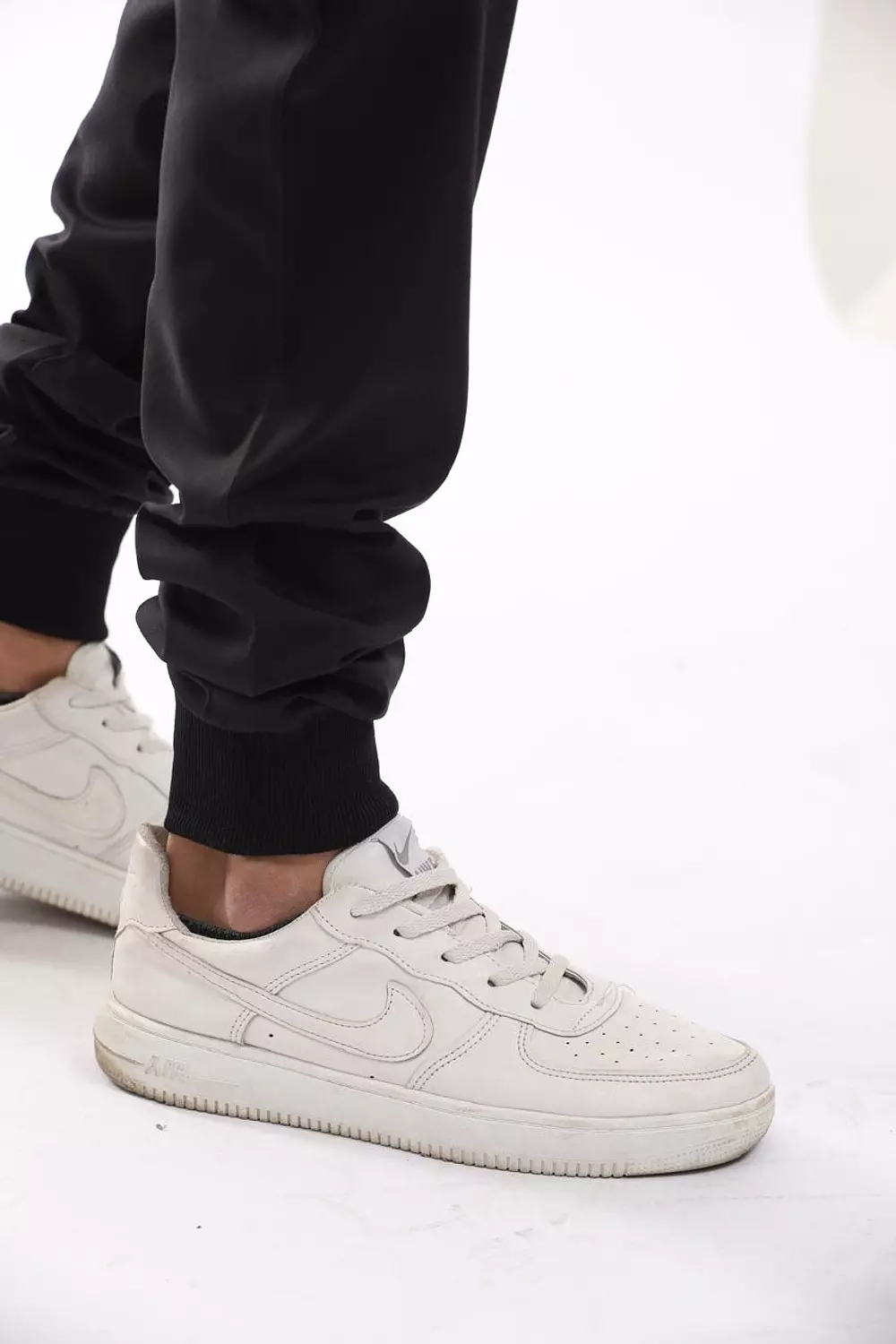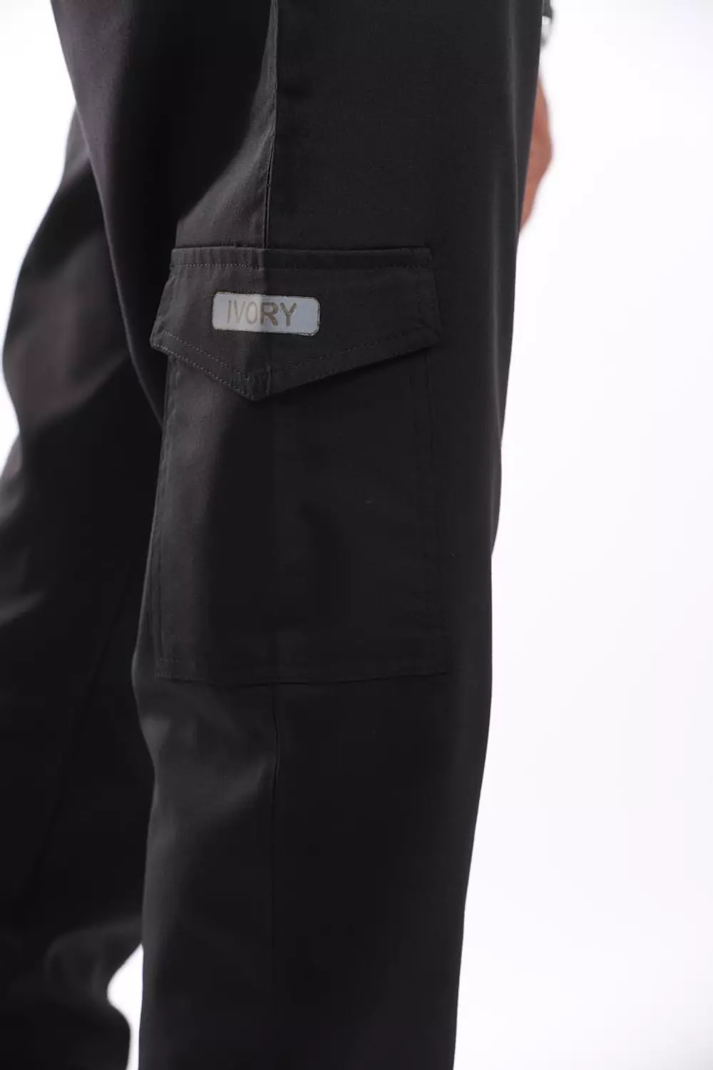 البنطلون: جوقر بحزام خصر مطاطي وأربطة. يتميز بجيوب أمامية، وجيب خلفي ، وجيوب جانبية عند الركبة، وشريط مطاطي في القدم للقدم الخامة:قماش معالج ليكرا بوليستر.