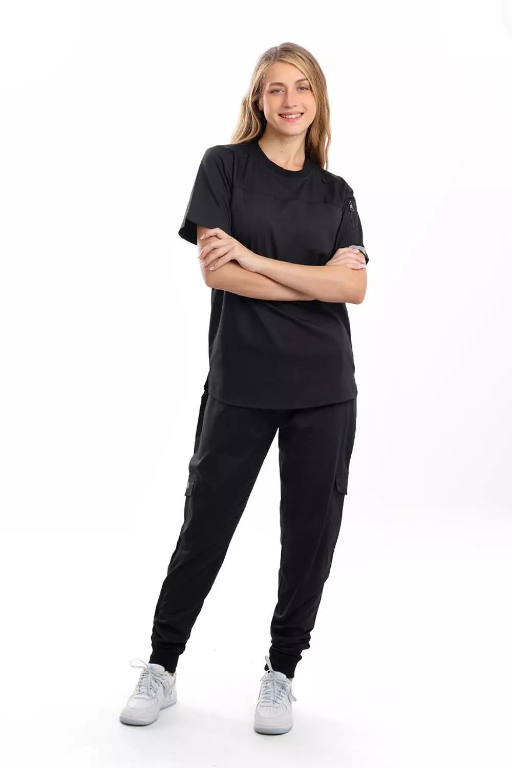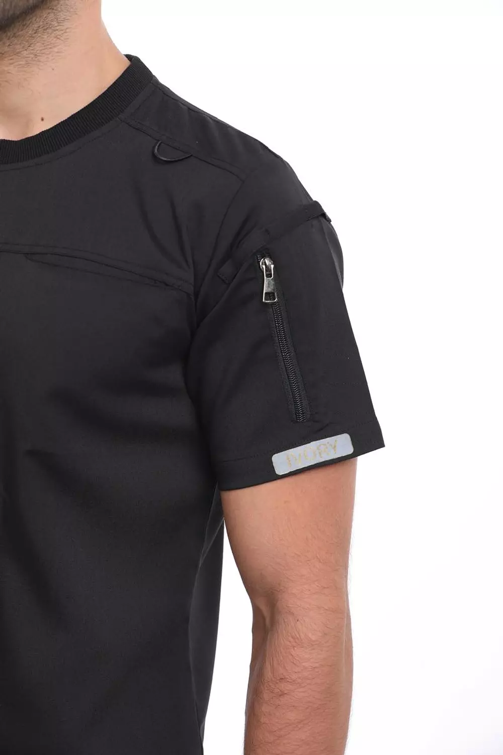 Top: Round Neck shirt featuring a Round Neck, short sleeves, two chest front welt pocket, side shoulder welt zipper pocket.