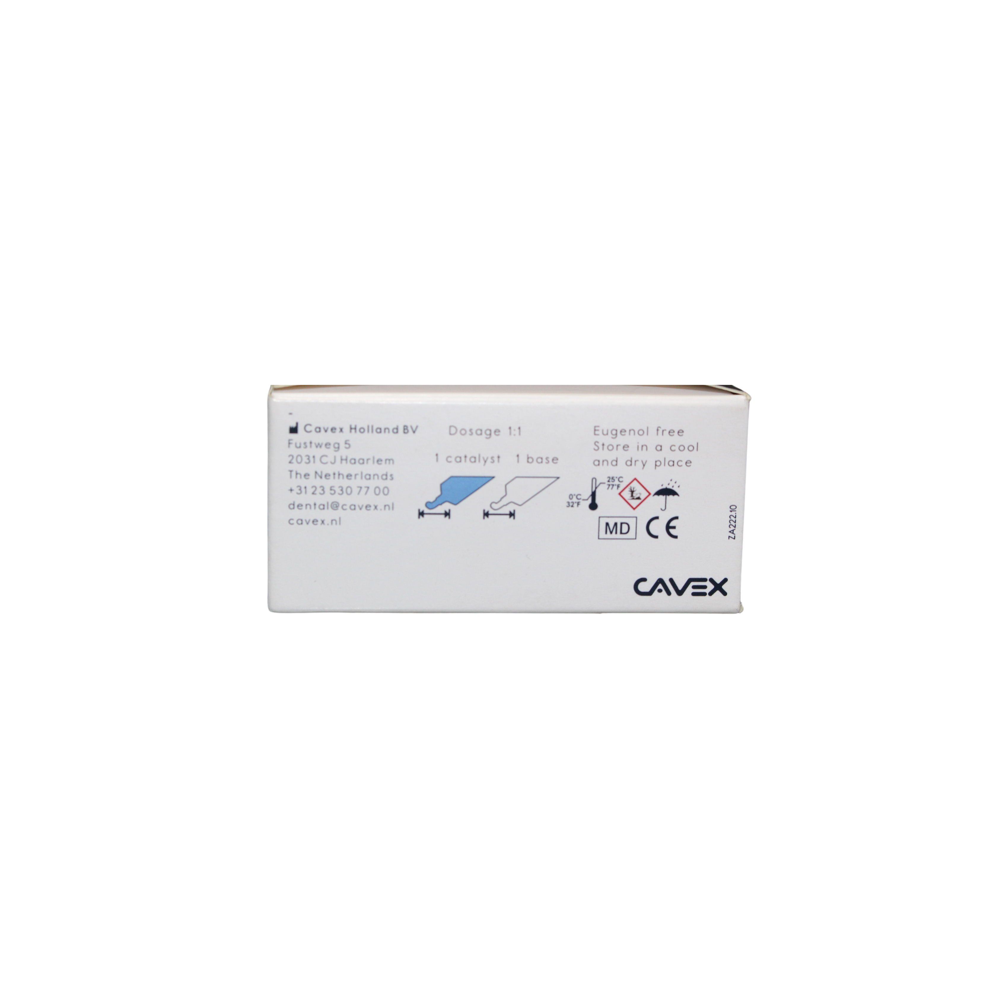 Cavex Outline, Impression Paste Eugenol Free is supplied as a two-paste system in the contrasting colours blue and white. Squeezing out lines of equal length will dose the pastes in the