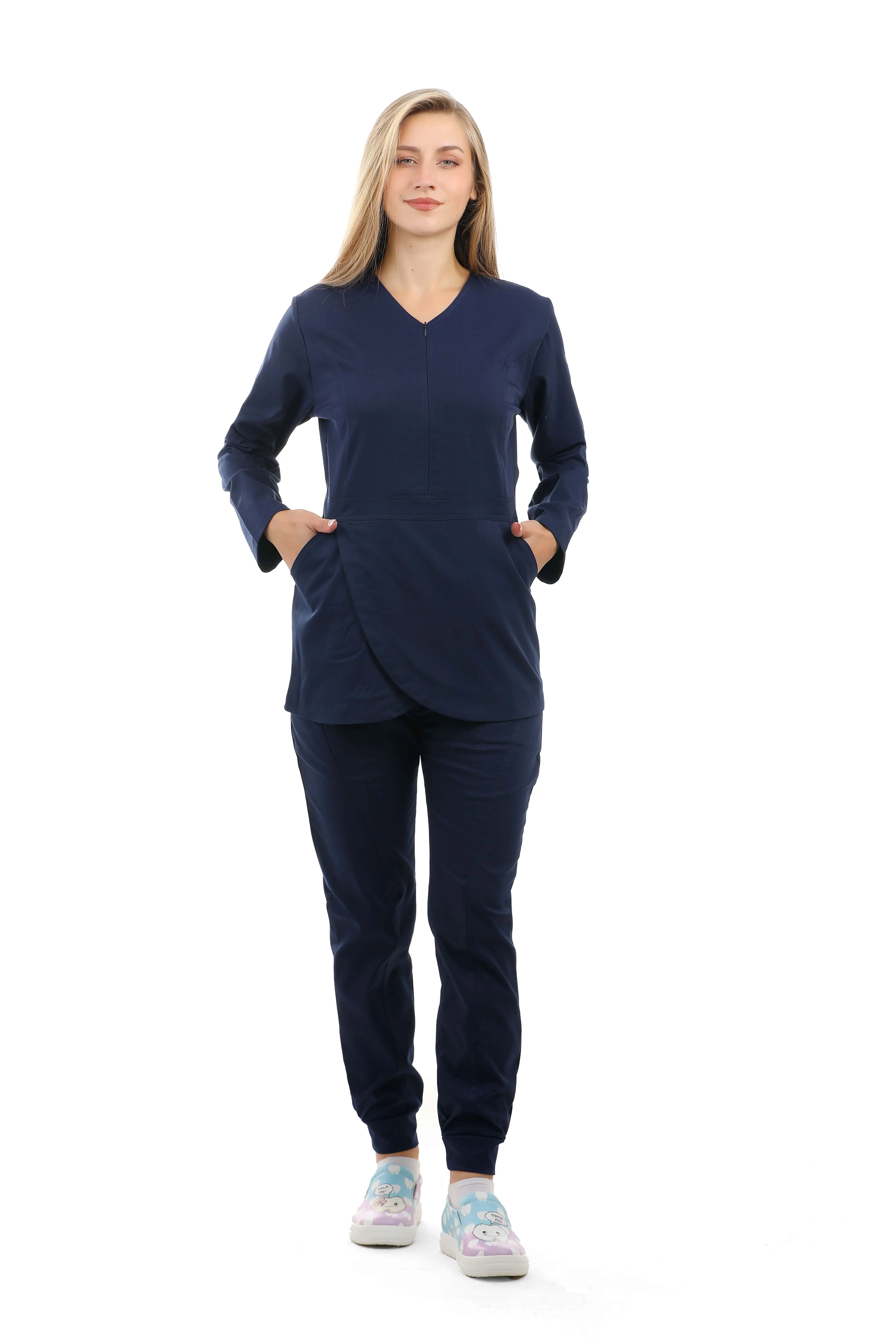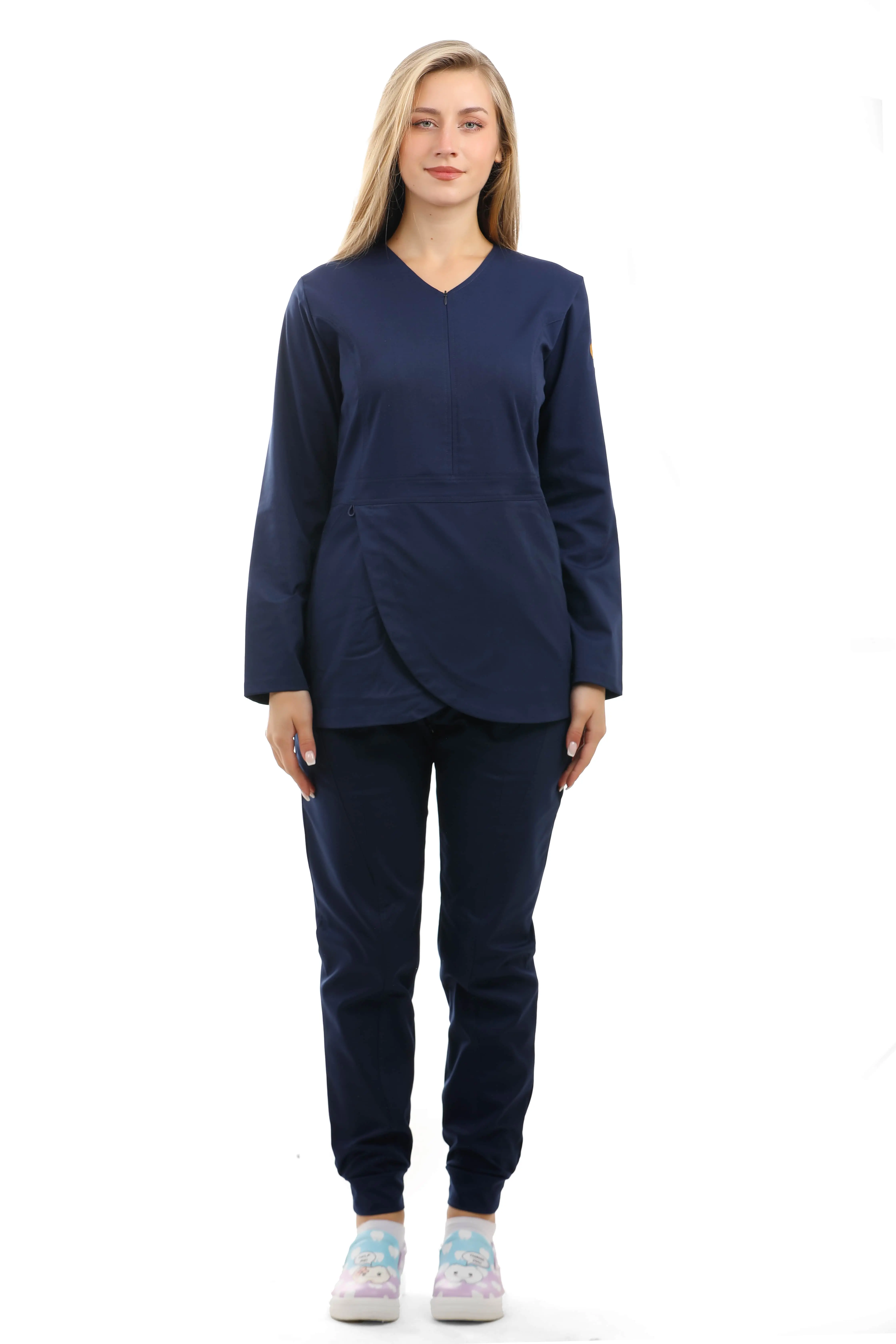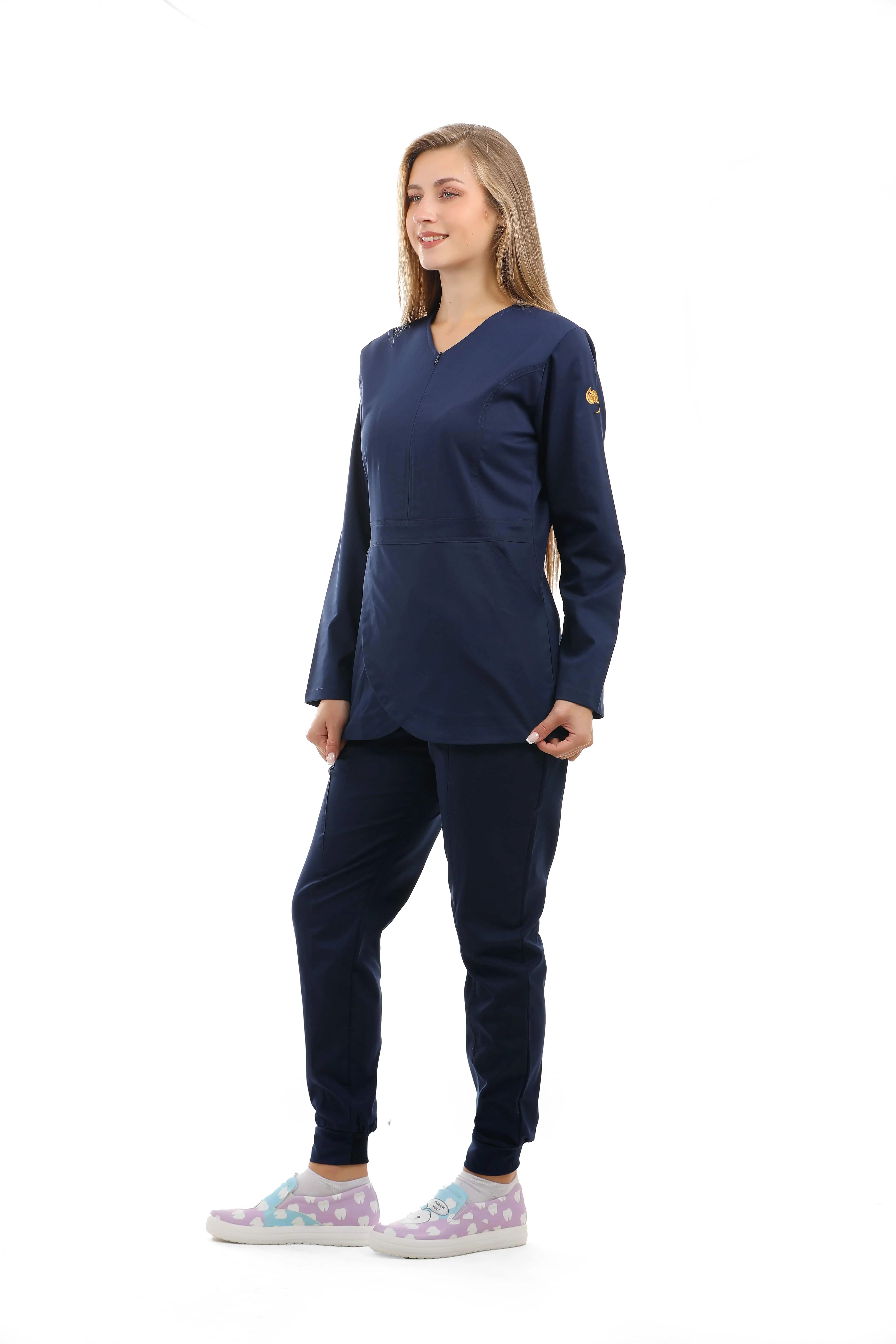 المزايا: سكراب علوي من قماش الليكرا على شكل زهرة التيوليب , جيوب امامية , سحاب على الصدر غير مرئي ,  مريح جدًا للأطباء الذين يعملون بجهد , تصميم سروال فاخر يتميز بجيبين أماميين , اساور مطاطية في القدم بشكل جمالي