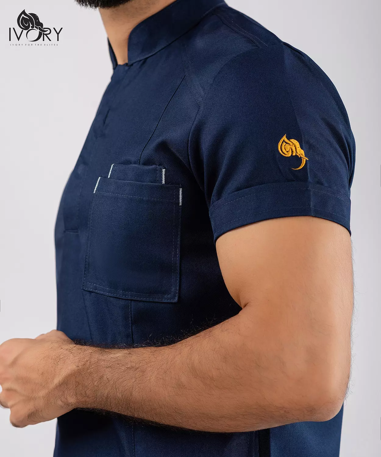Features: Anti-Shrinkage & Anti-Wrinkle half collar shirt featuring a half collar, short sleeves with ribbed cuffs, front patch pockets, side welt pockets, side vents at the hem and front invisible button fastening.