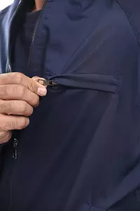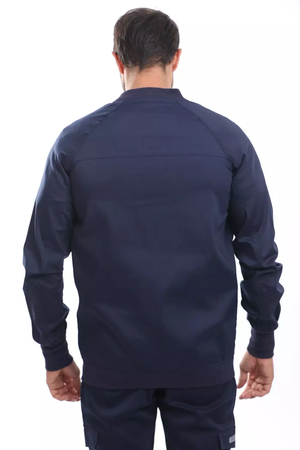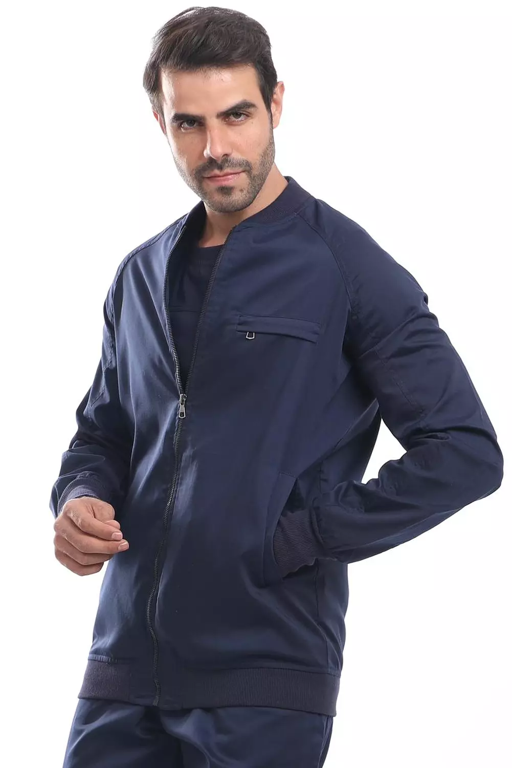 Round Neck jacket featuring a Round Neck, long sleeves, chest front welt pocket, side welt pockets, elastic band wrist, waist elastic band, two invisible inner patch pockets.