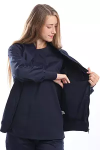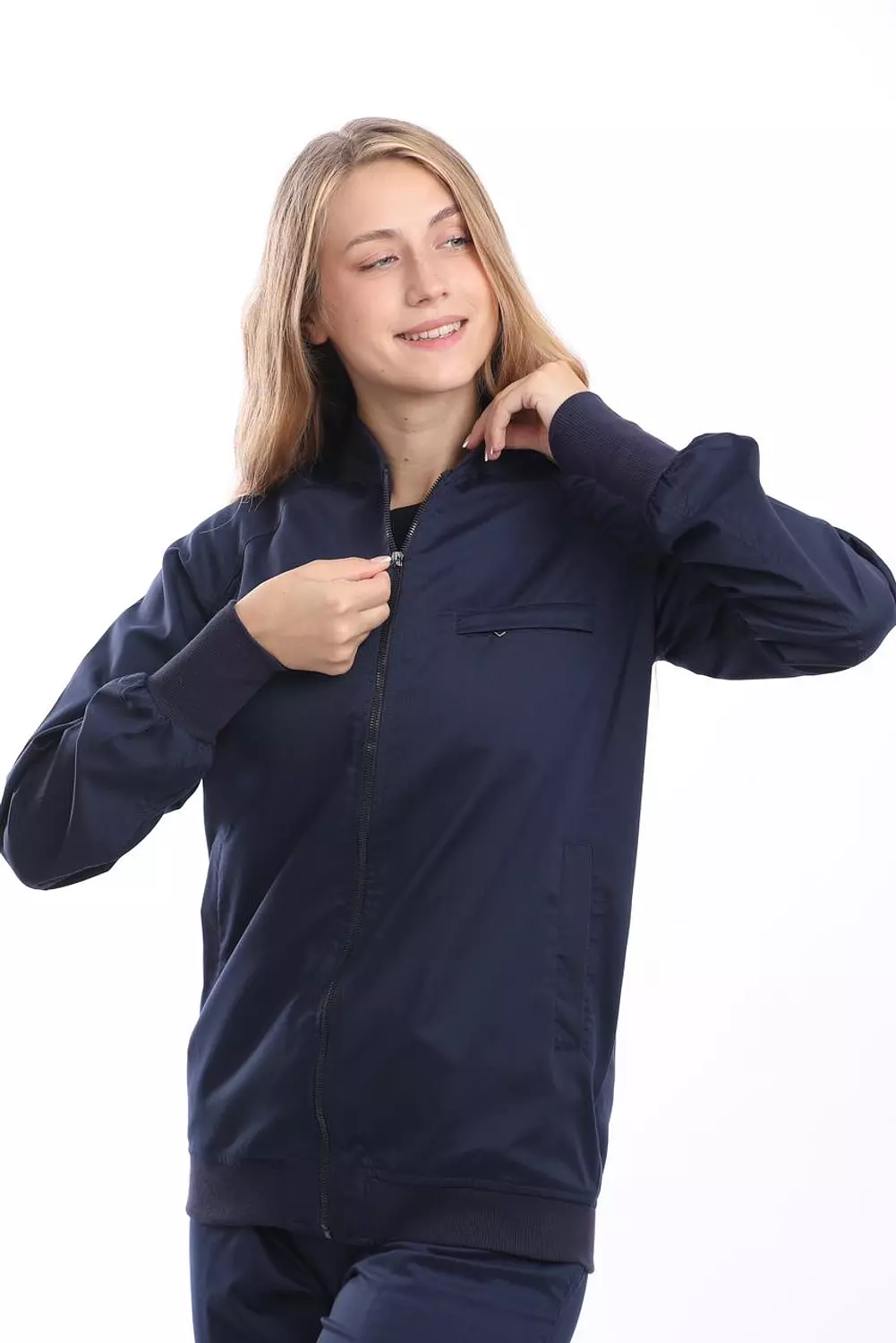 جاكيت برقبة دائرية، تتميز برقبة دائرية، وأكمام طويلة، وجيب أمامي على الصدر، وجيوب جانبية ، ومعصم بشريط مطاطي، وحزام خصر مطاطي، وجيبين داخليين غير مرئيين.