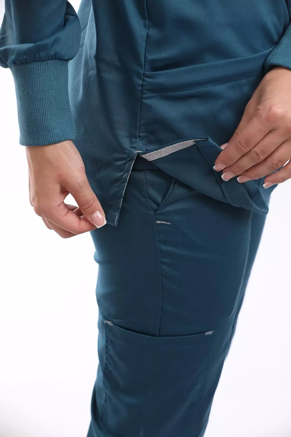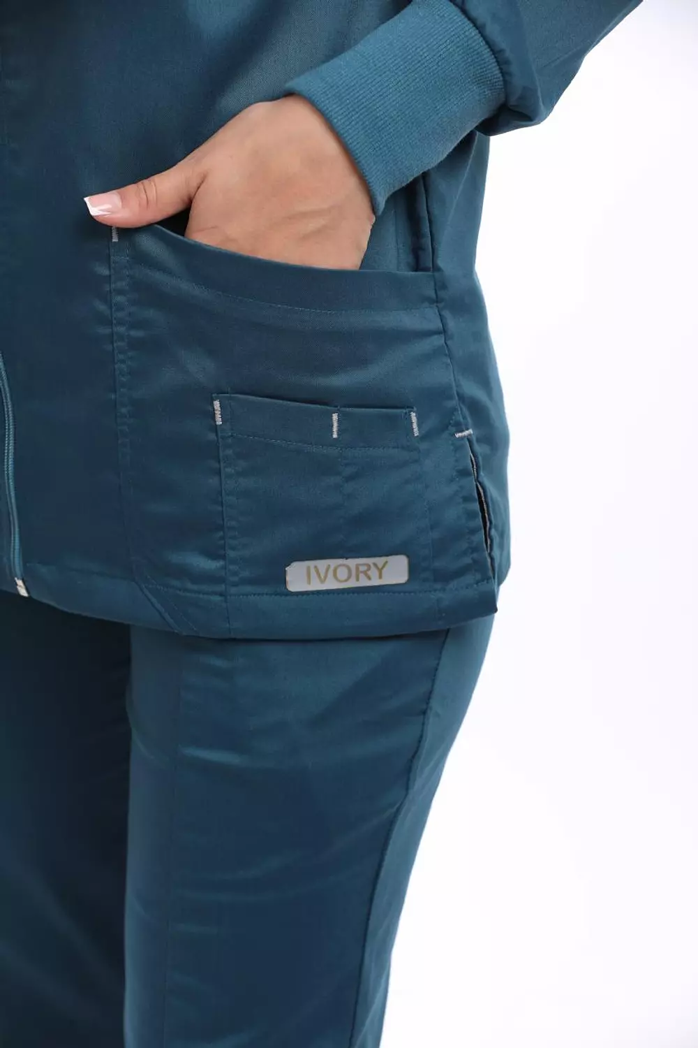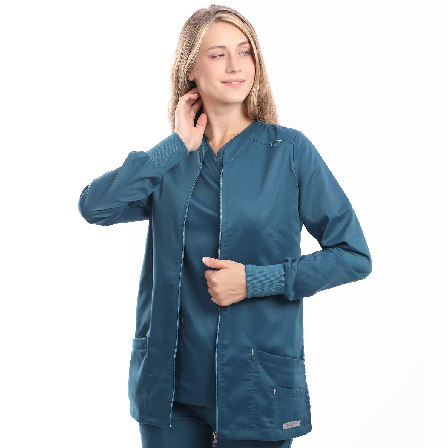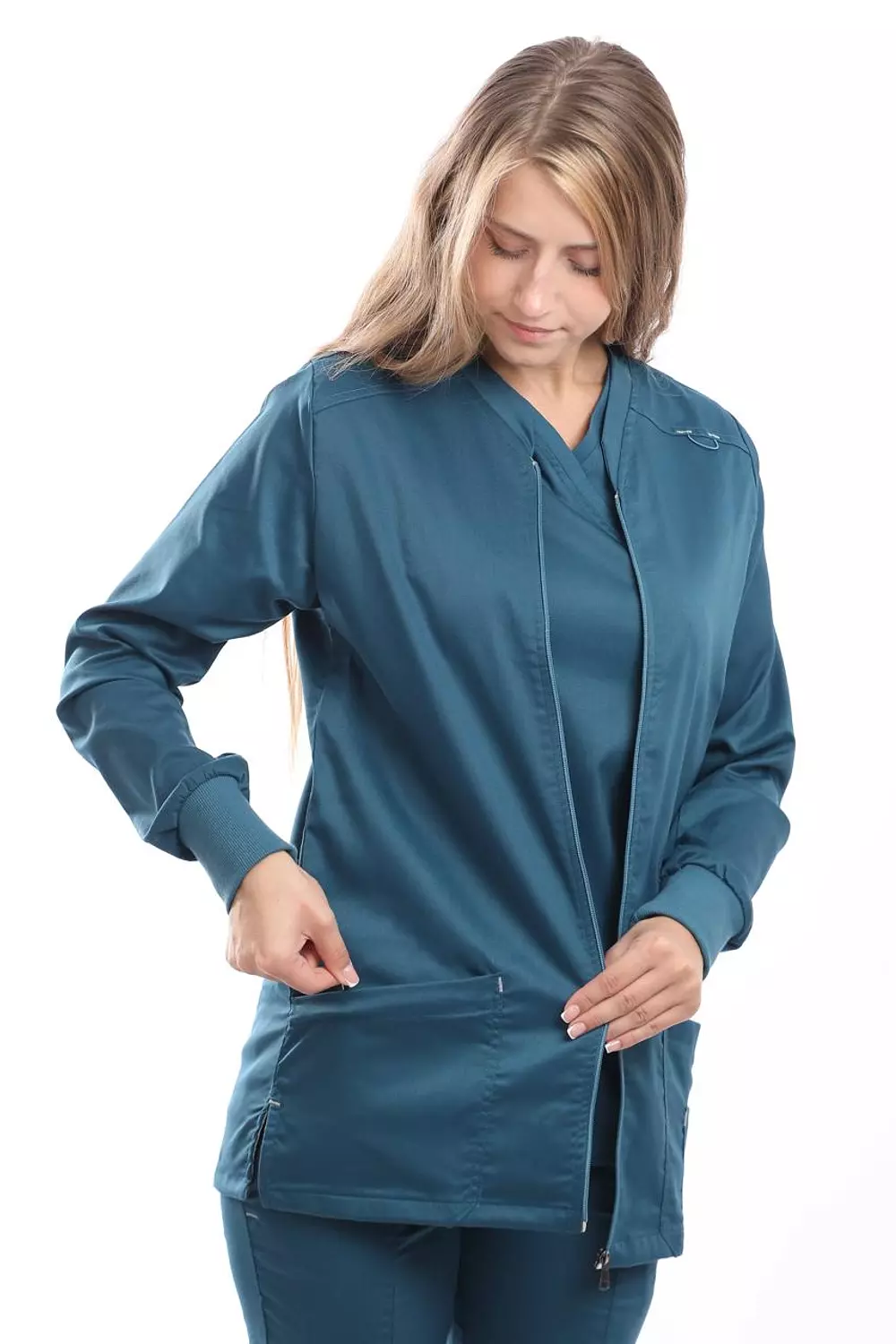 جاكيت برقبة على شكل حرف V، وأكمام طويلة، وأربعة جيوب أمامية، وفتحات جانبية عند الخصر، وشريط معصم مطاطي.