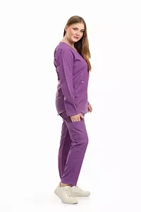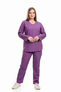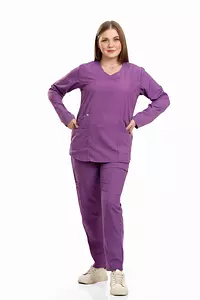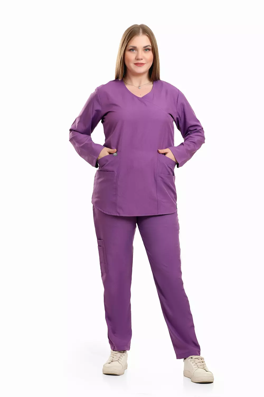 سكراب بفتحة صدر على شكل حرف V مائل، يتميز برقبة على شكل حرف V وأكمام طويلة وجيوب أمامية وقصة جانبية مستديرة.