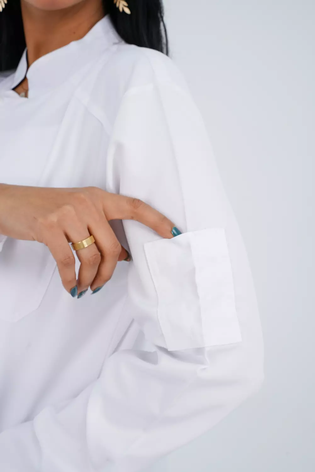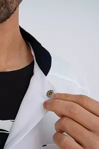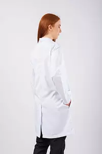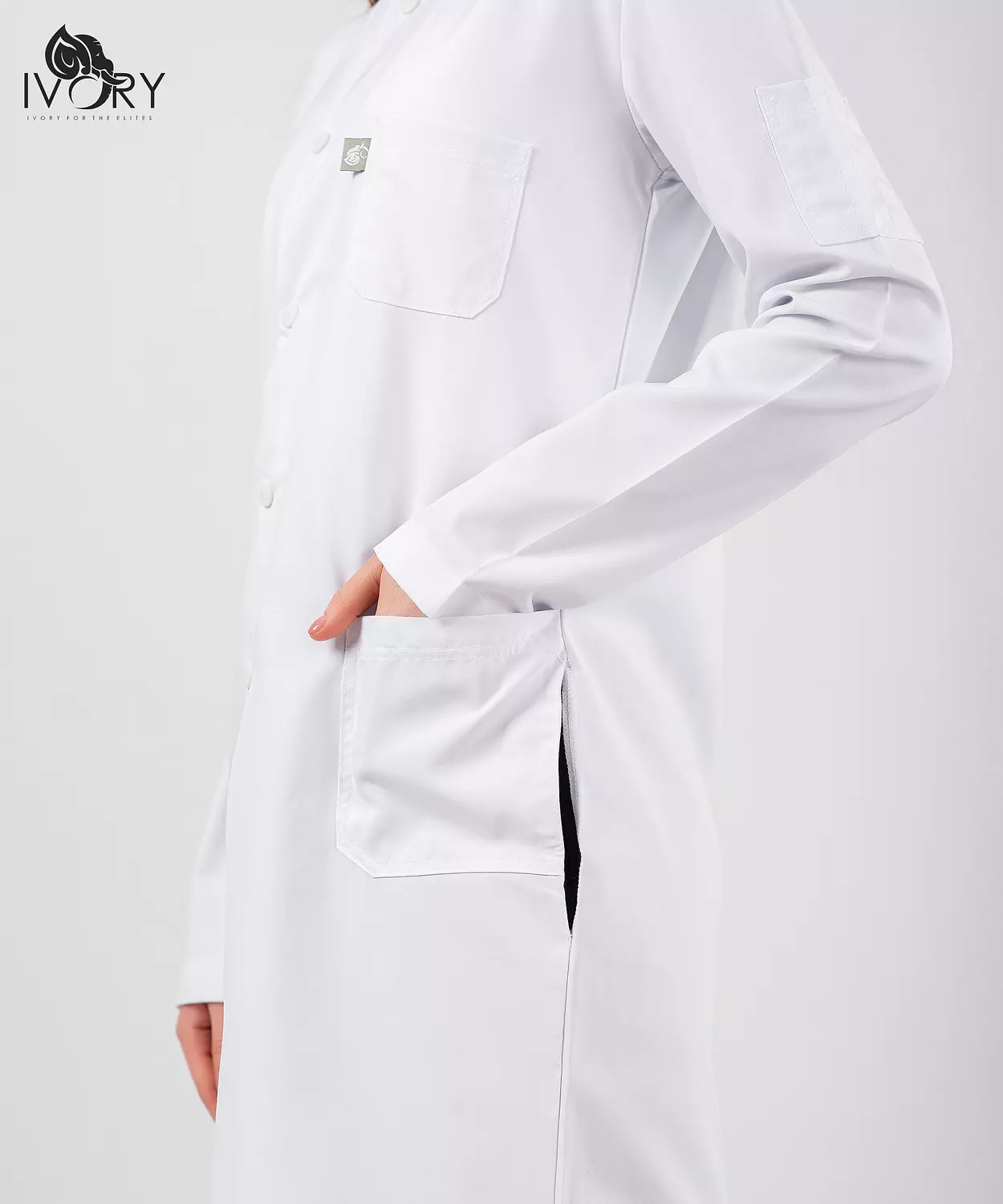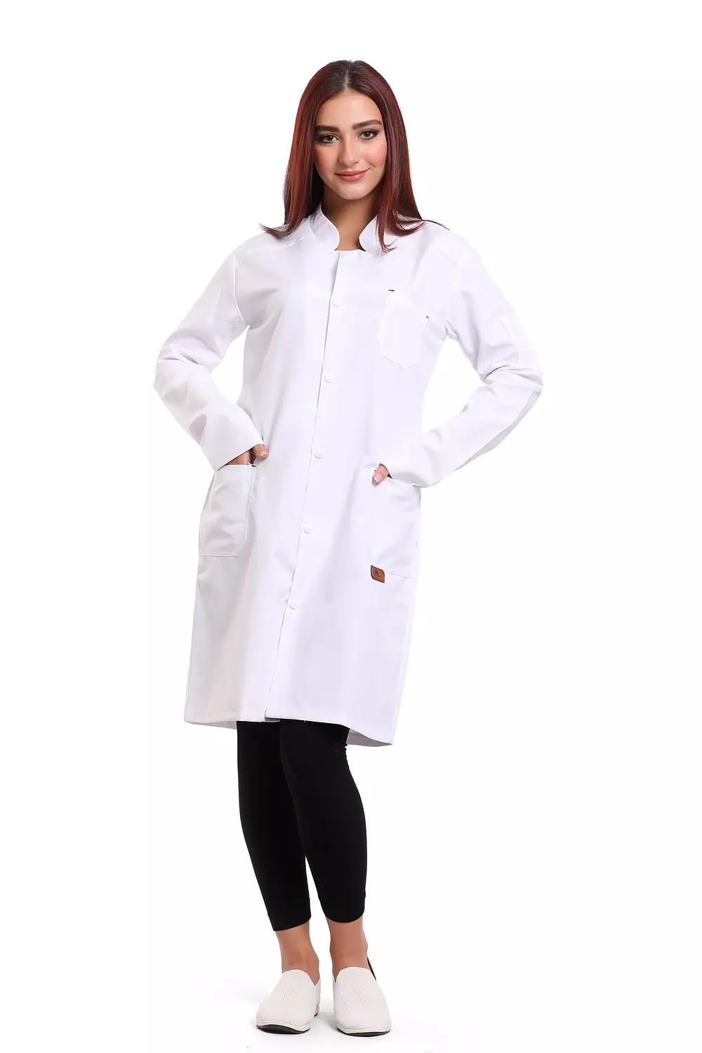 Features: Anti-Shrinkage lab coat featuring half collar, long sleeves, front patch pockets, snap buttons front, side splitting.