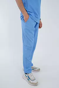 بنطلون بحزام خصر مطاطي وأربطة. جيوب أمامية، وجيب في الخلف، وجيوب جانبية عند الركبة.