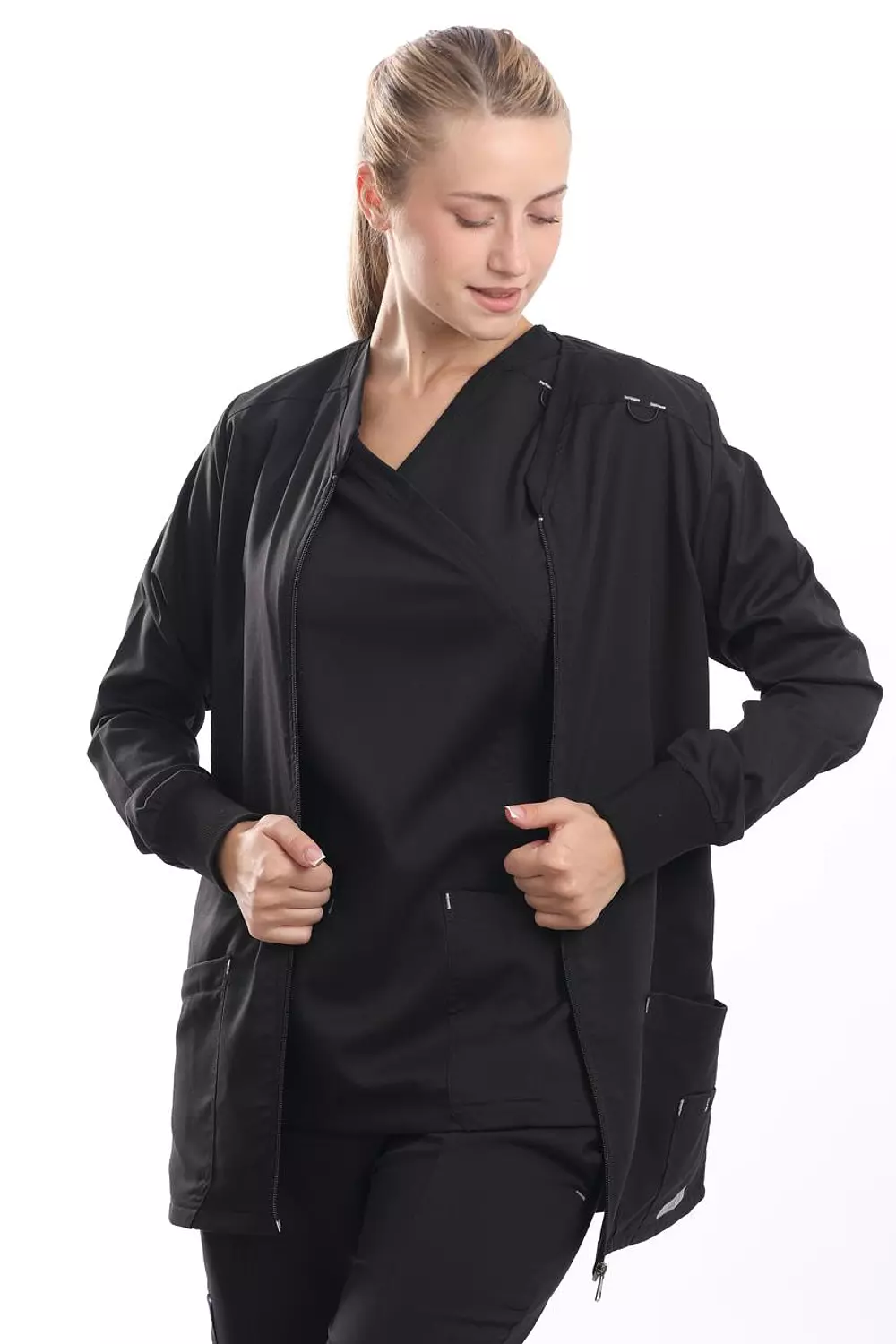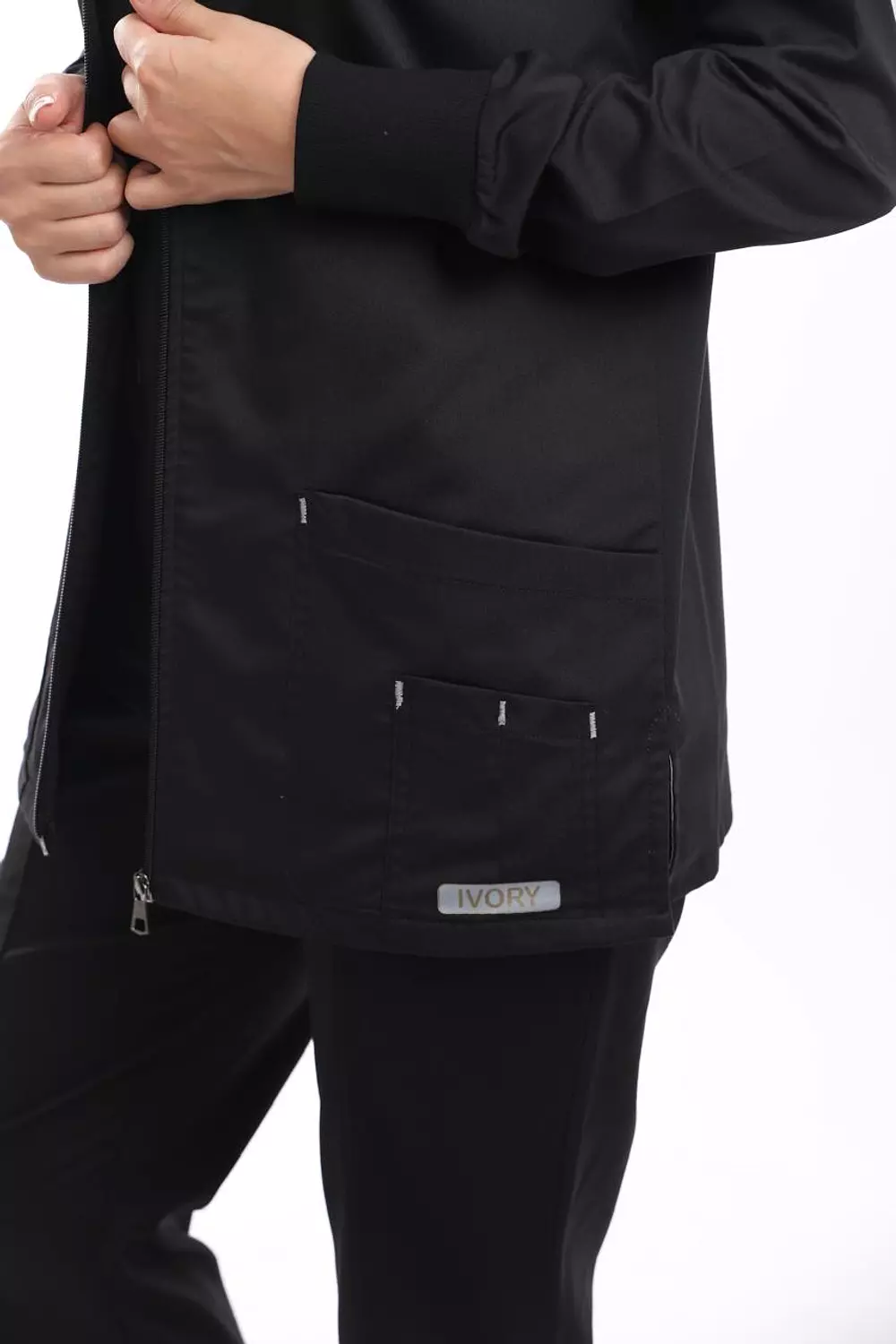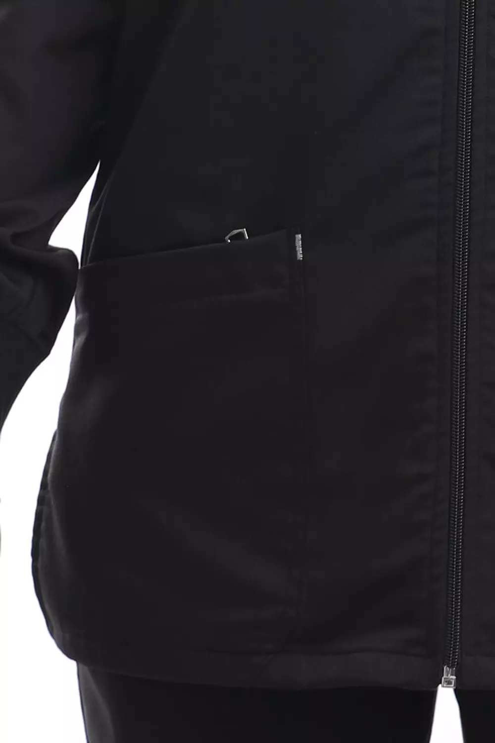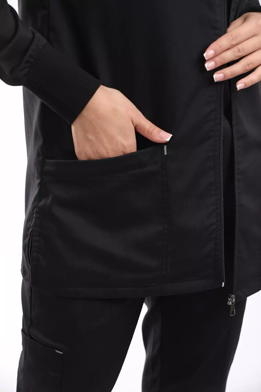 جاكيت برقبة على شكل حرف V، وأكمام طويلة، وأربعة جيوب أمامية، وفتحات جانبية عند الخصر، وشريط معصم مطاطي.
