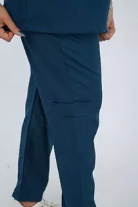بنطلون بحزام خصر مطاطي وأربطة. جيوب أمامية، وجيب في الخلف، وجيوب جانبية عند الركبة.