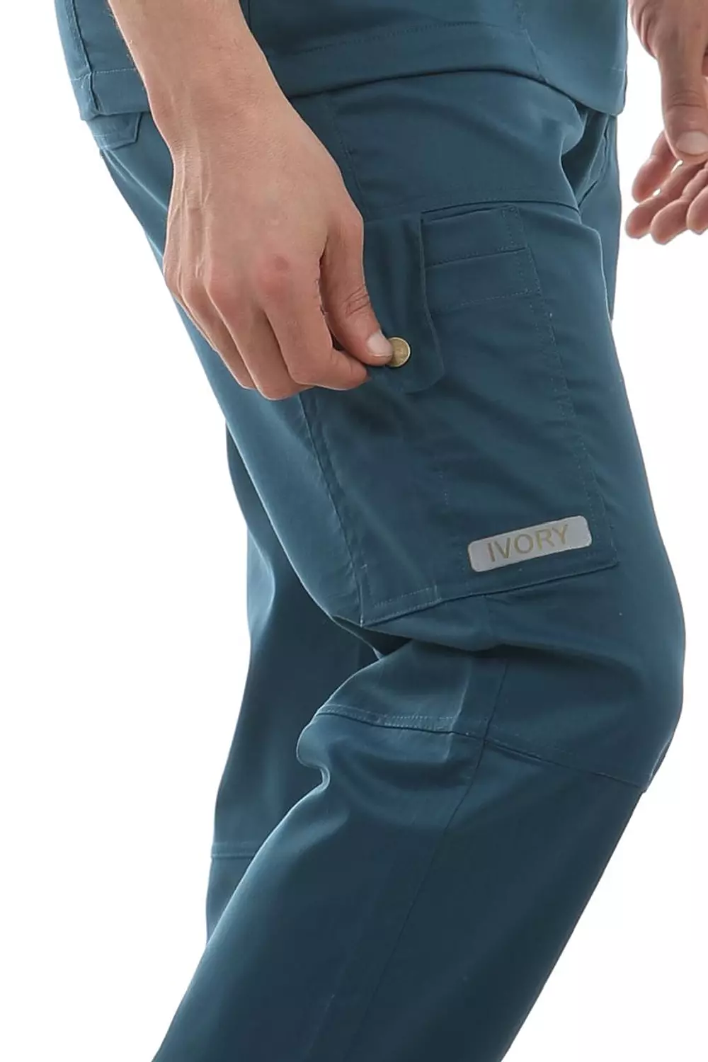 البنطلون: البنطلون على شكل فضفاض بحلقات للحزام وجيوب جانبية وجيبين خلفيين. سحاب أمامي وزر للإغلاق.