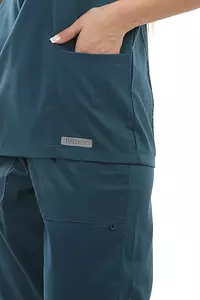 Top: V Neck shirt featuring a V Neck, short sleeves, front chest patch pocket, front waist patch pockets.