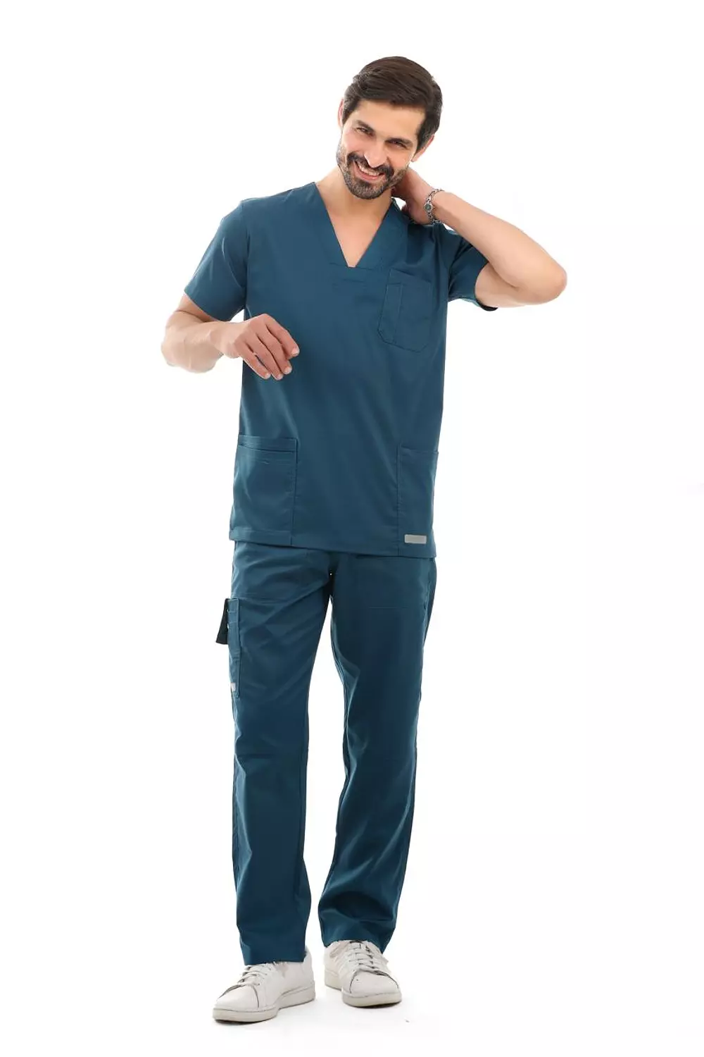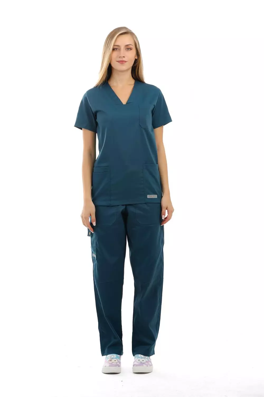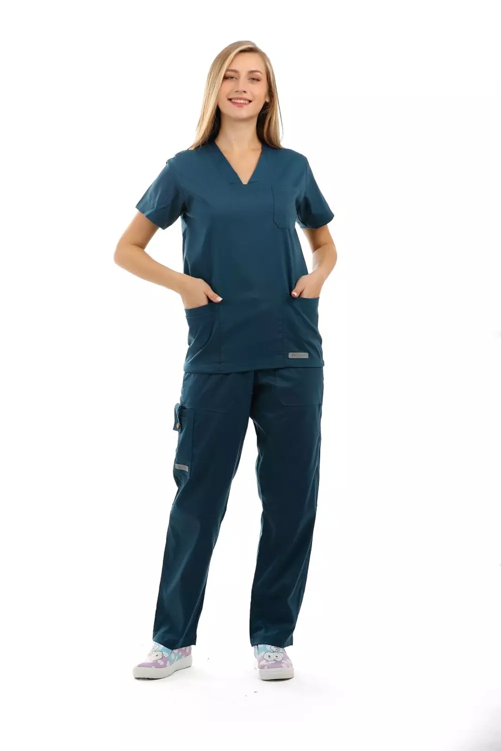 القميص: قميص برقبة على شكل حرف V، يتميز برقبة على شكل حرف V، وأكمام قصيرة، وجيب أمامي على الصدر، وجيوب أمامية على الخصر.