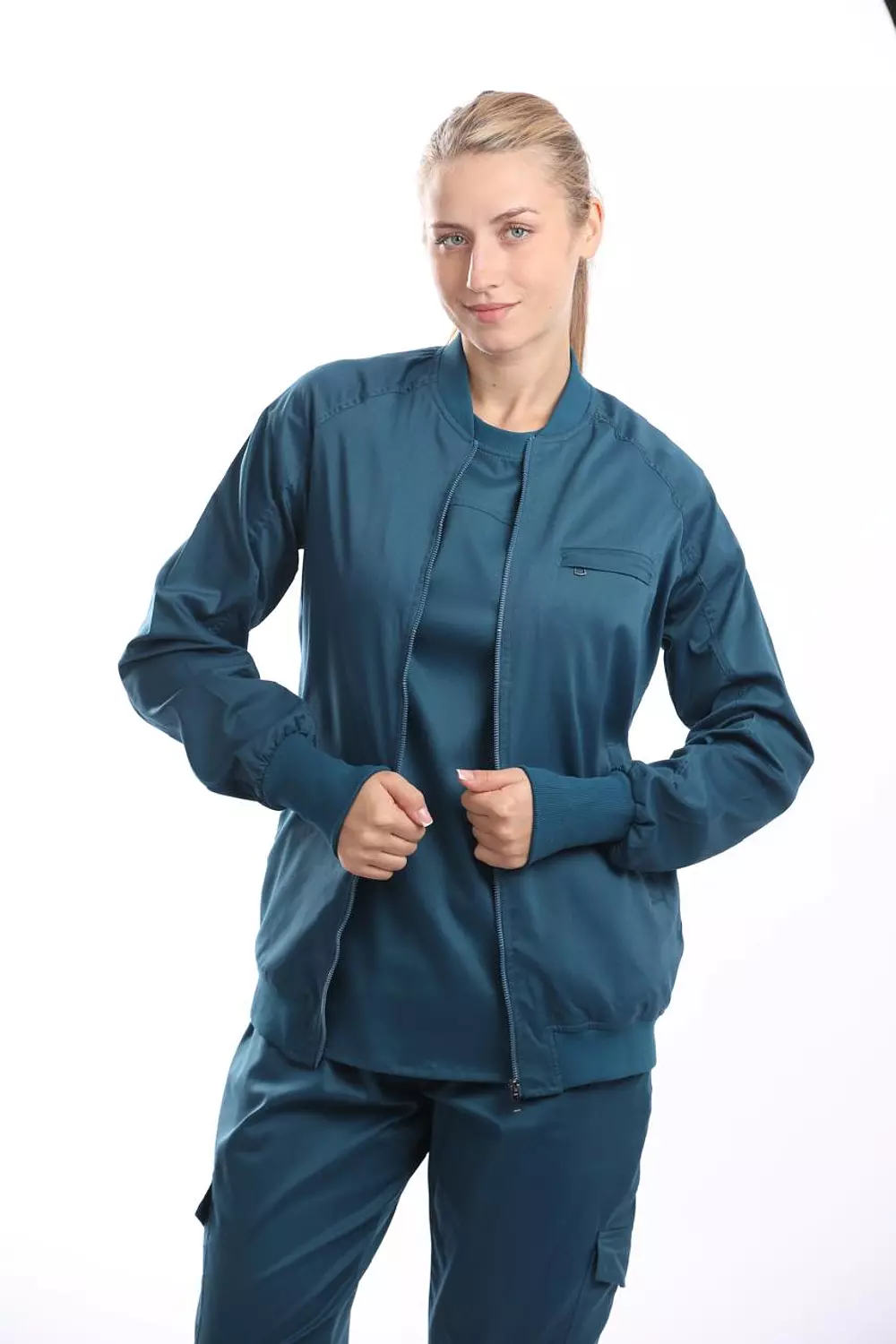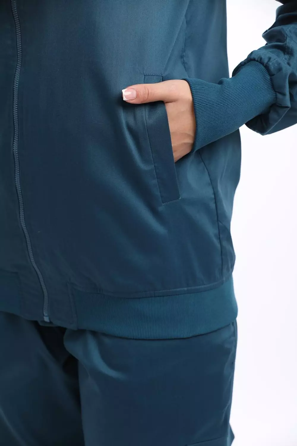 جاكيت برقبة دائرية، تتميز برقبة دائرية، وأكمام طويلة، وجيب أمامي على الصدر، وجيوب جانبية ، ومعصم بشريط مطاطي، وحزام خصر مطاطي، وجيبين داخليين غير مرئيين.