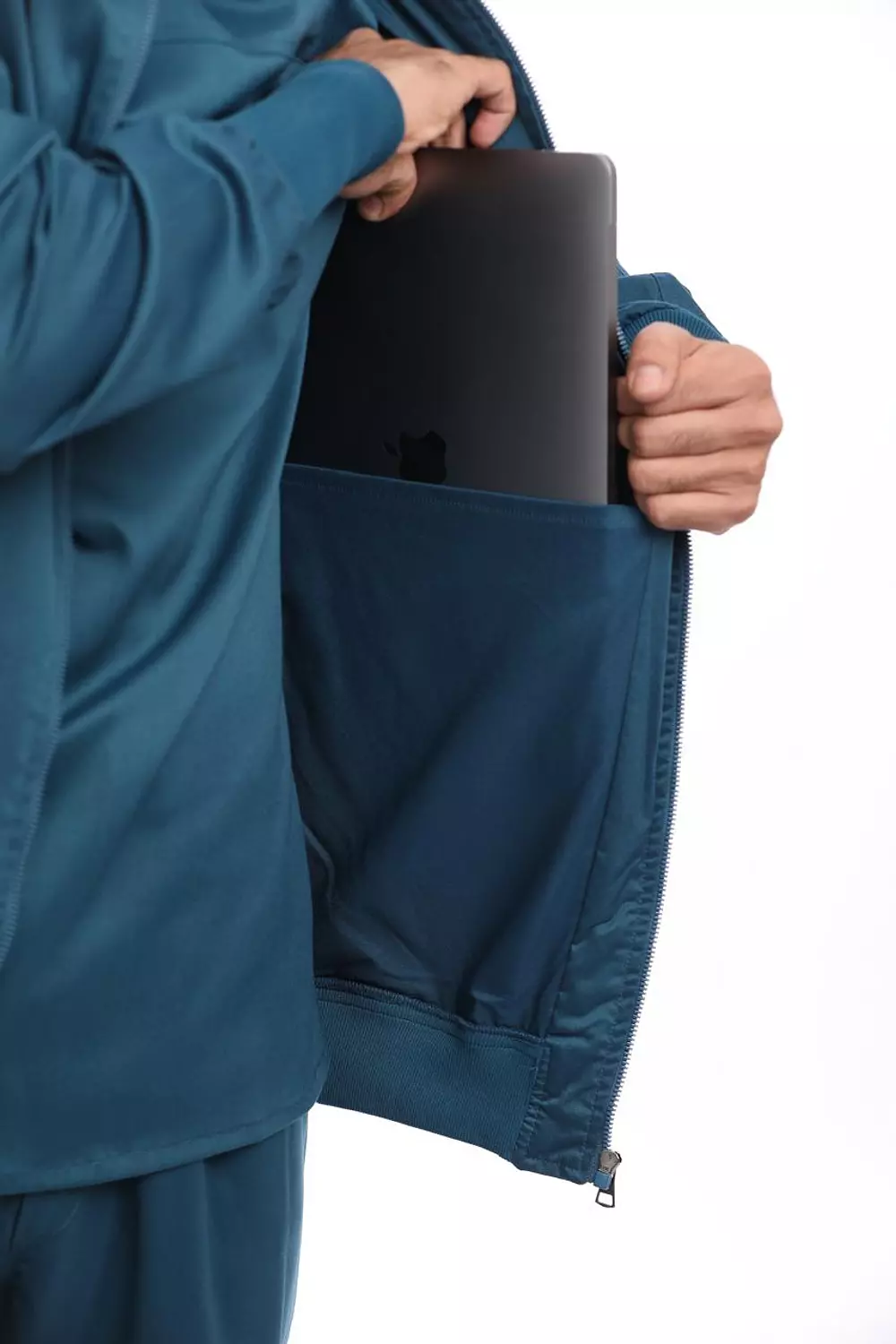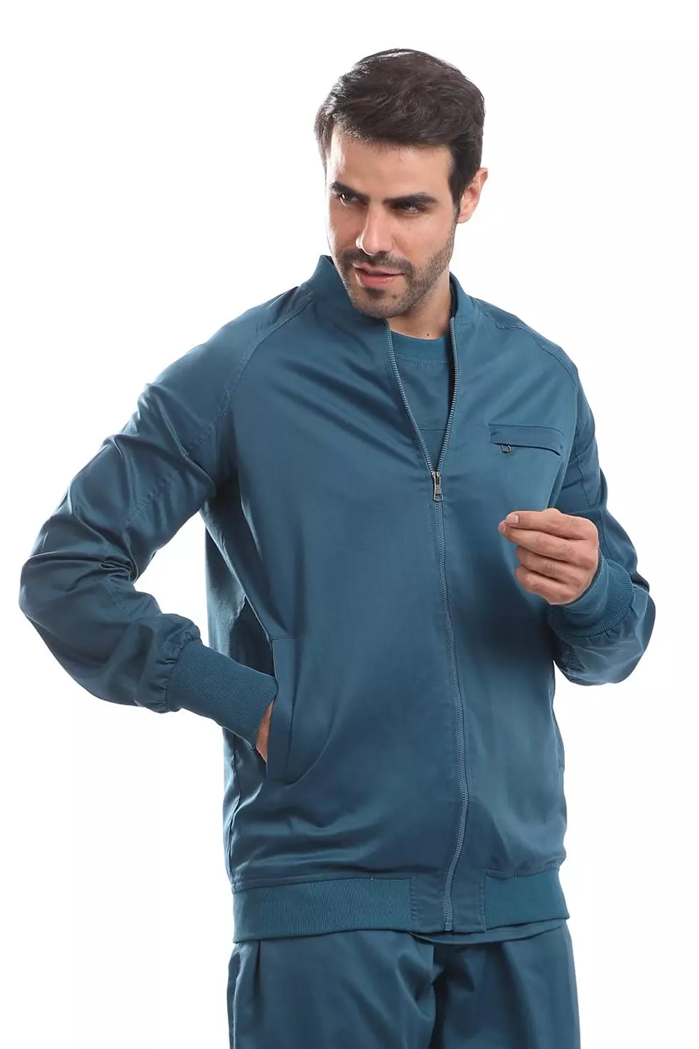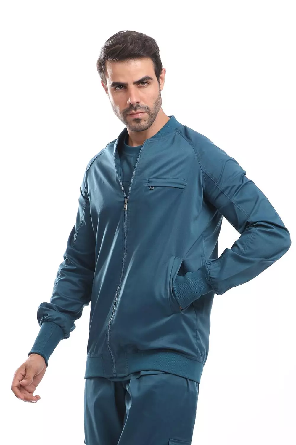 Round Neck jacket featuring a Round Neck, long sleeves, chest front welt pocket, side welt pockets, elastic band wrist, waist elastic band, two invisible inner patch pockets.