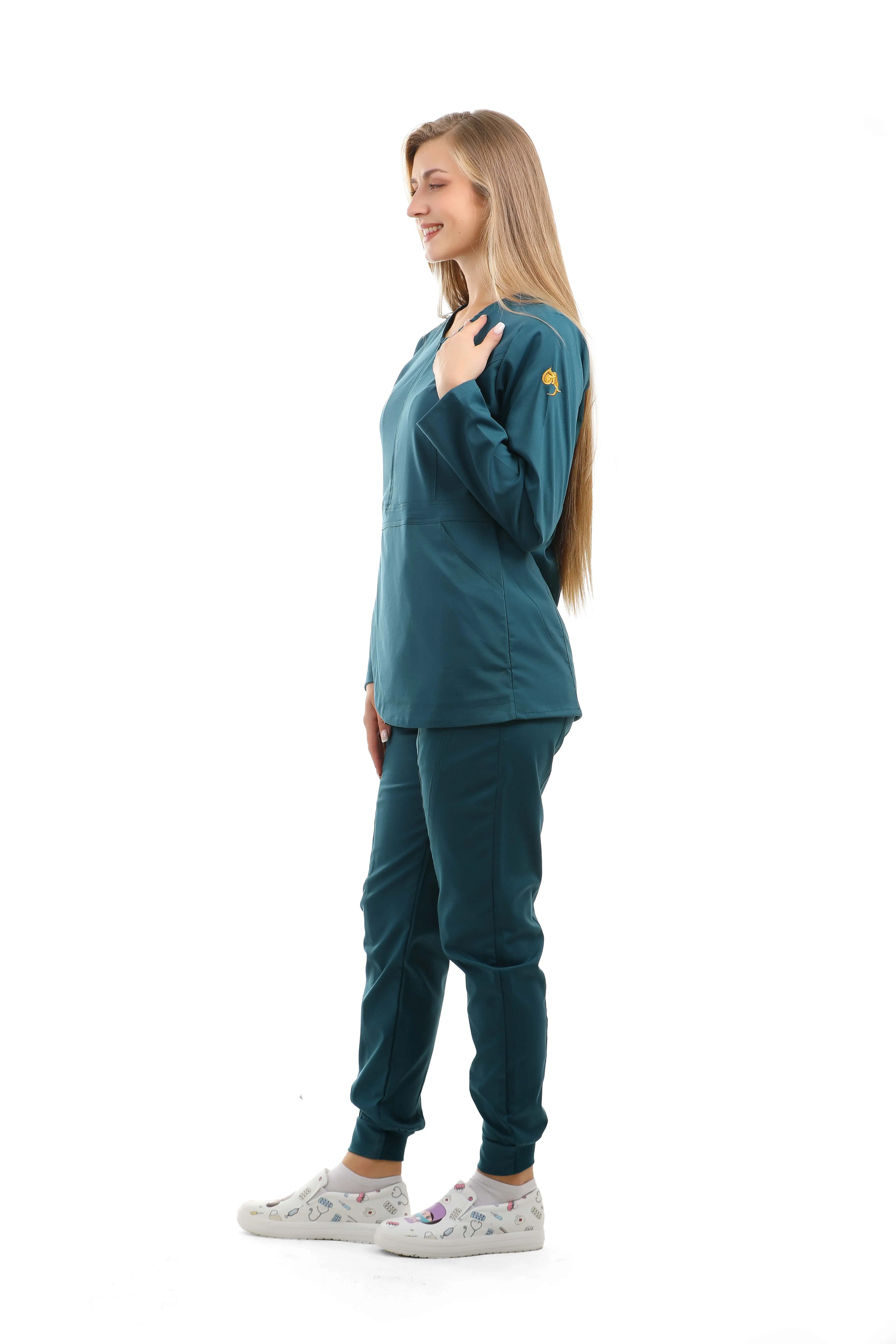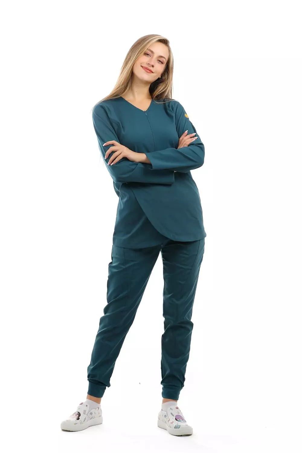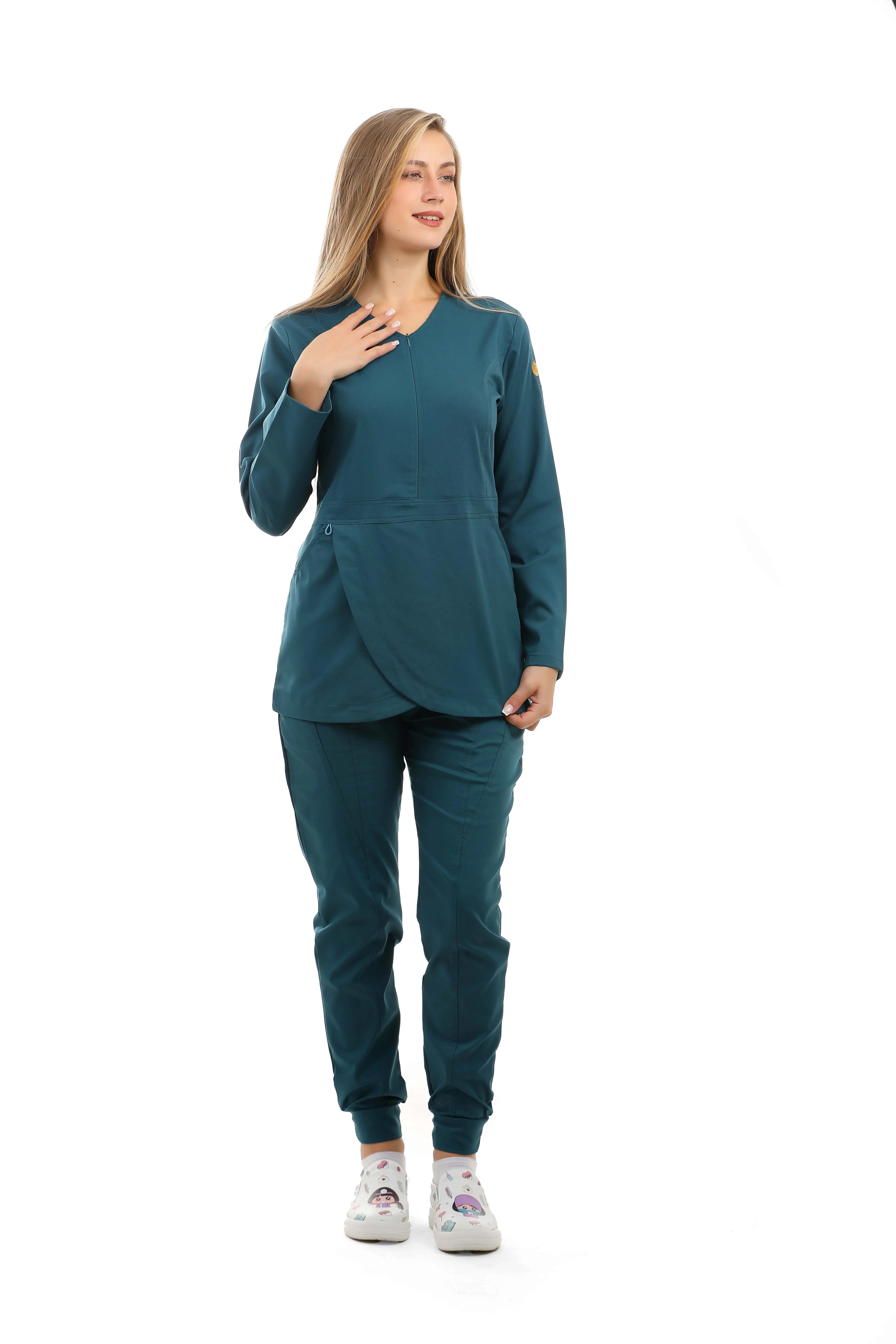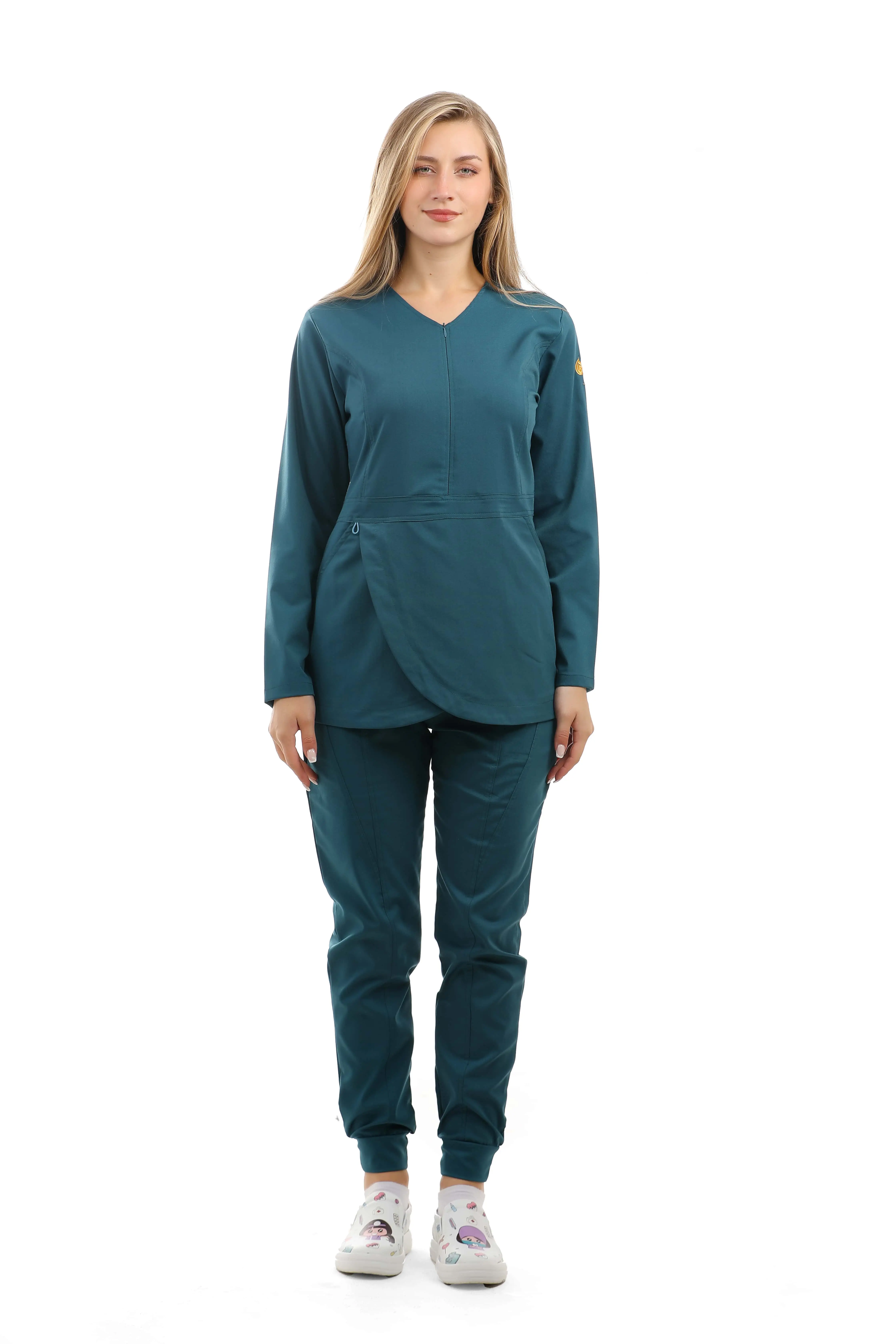المزايا: سكراب علوي من قماش الليكرا على شكل زهرة التيوليب , جيوب امامية , سحاب على الصدر غير مرئي ,  مريح جدًا للأطباء الذين يعملون بجهد , تصميم سروال فاخر يتميز بجيبين أماميين , اساور مطاطية في القدم بشكل جمالي