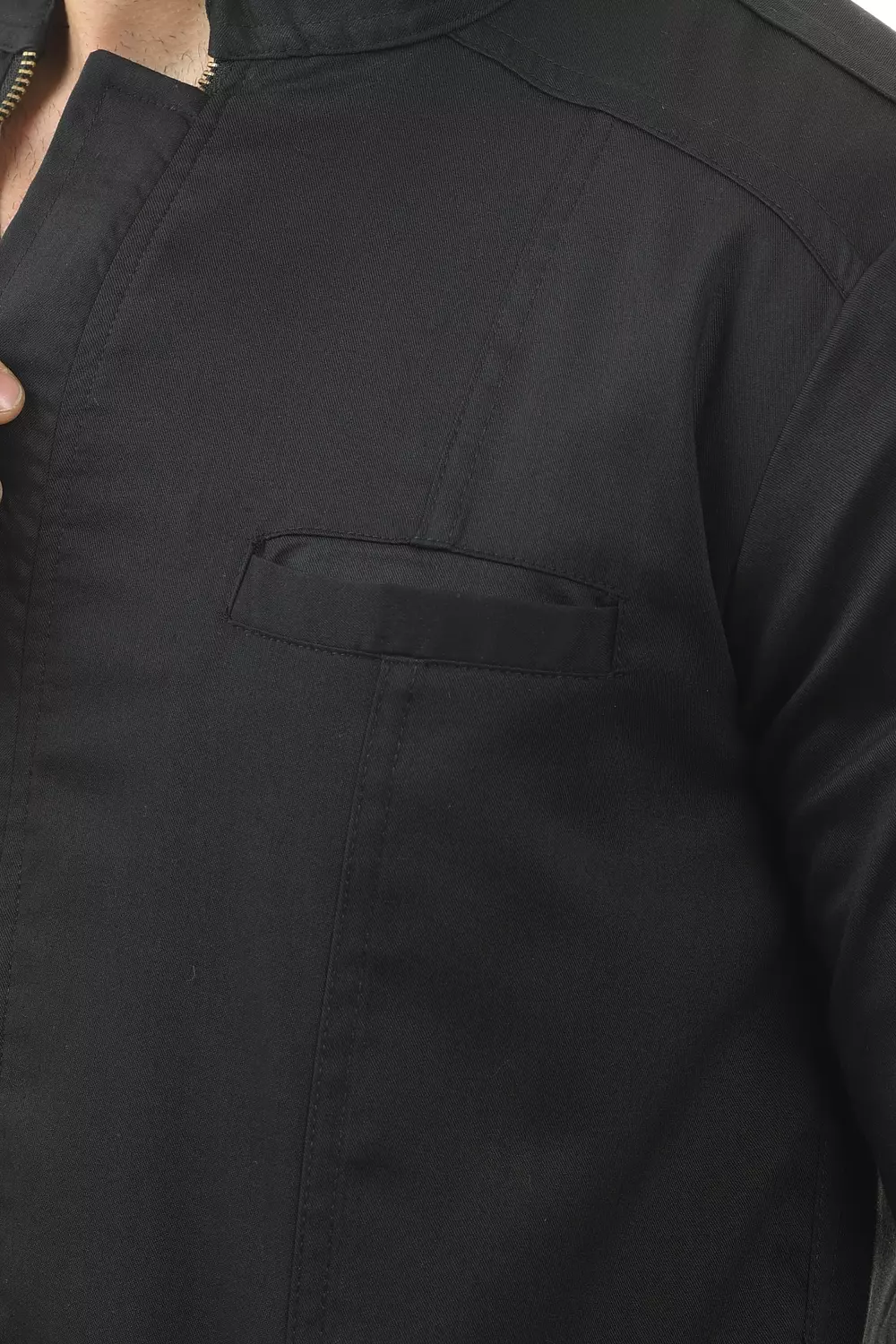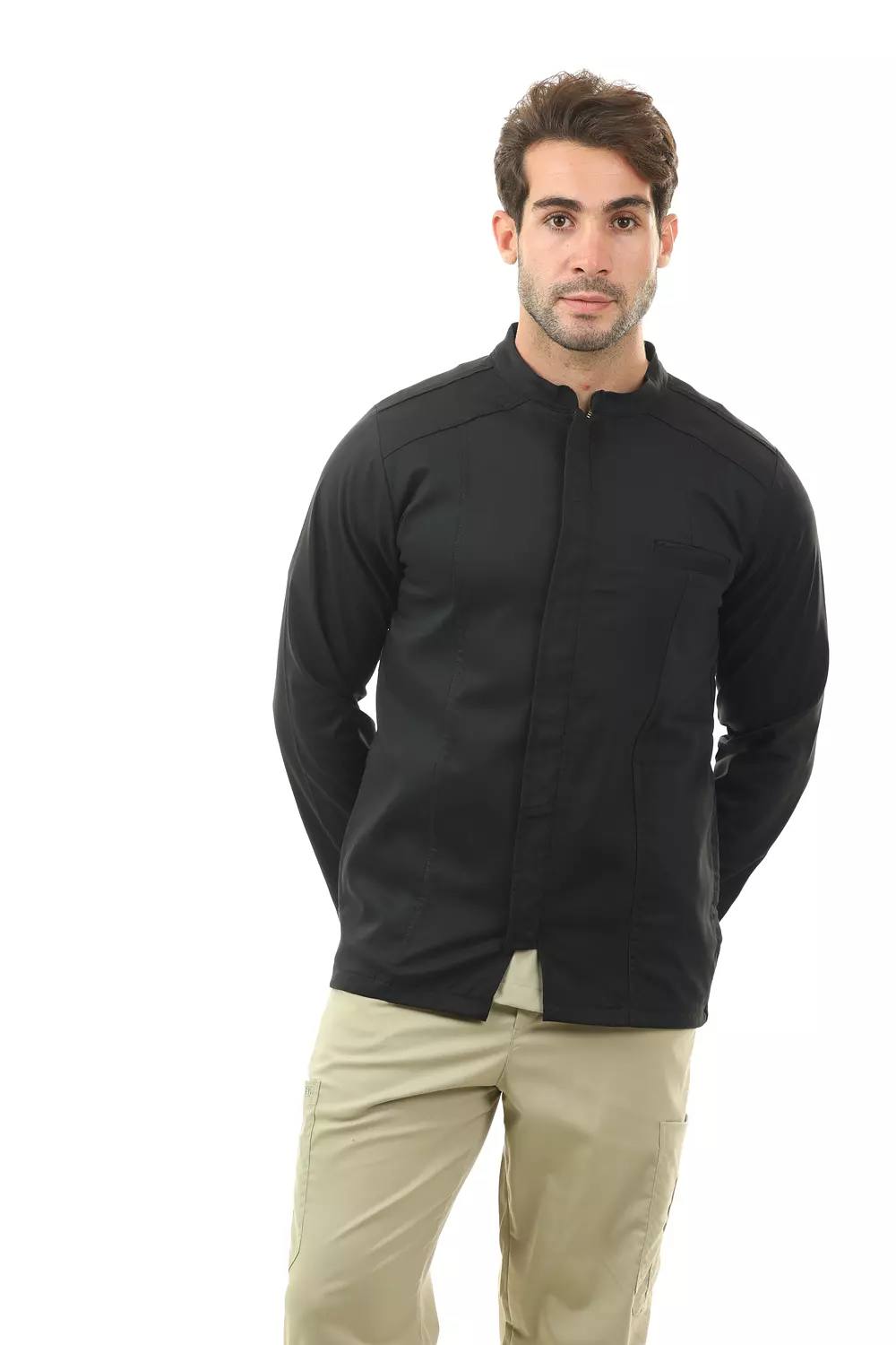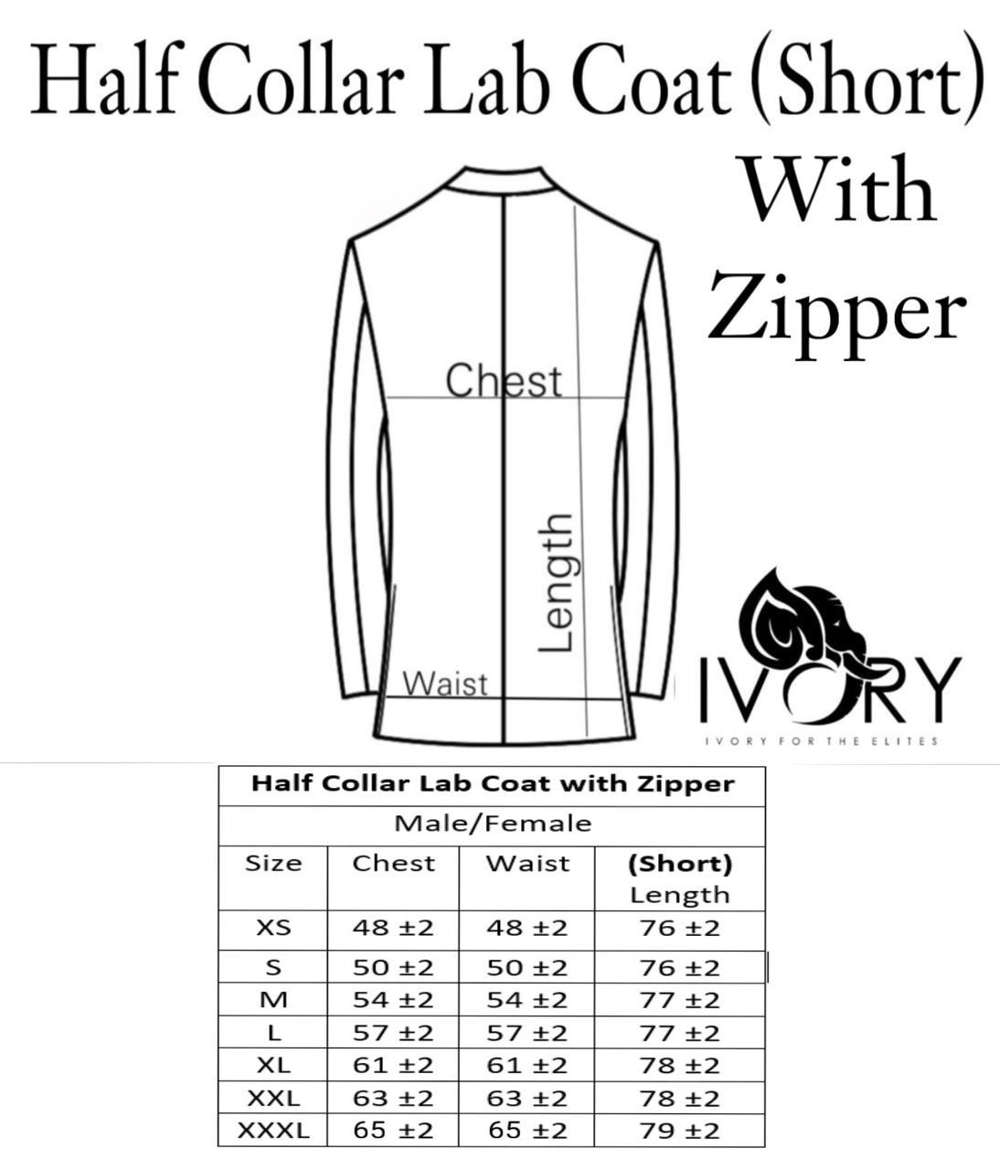 Features: Anti-Shrinkage & Anti-Wrinkle lab coat featuring half collar, long sleeves, side welt pockets and invisible zip-up front. front welt pocket.