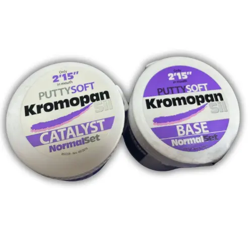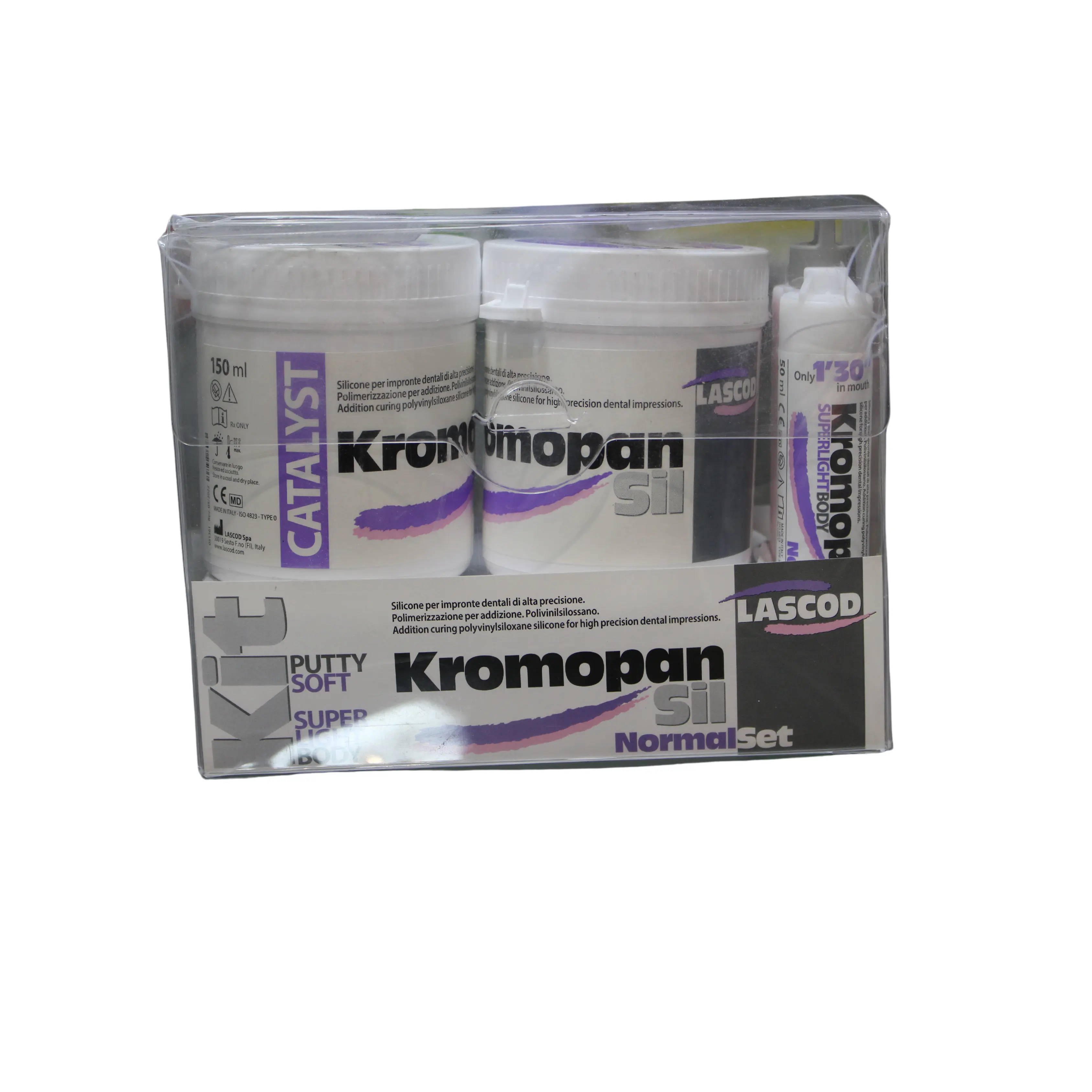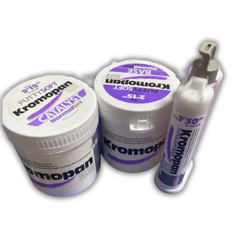 KromopanSil kit is composed of : KromopanSil putty (base + catalyst, 2 x 150 ml), KromopanSil body (1 x 50 ml), 6 mixing tips and 6 oral tips.