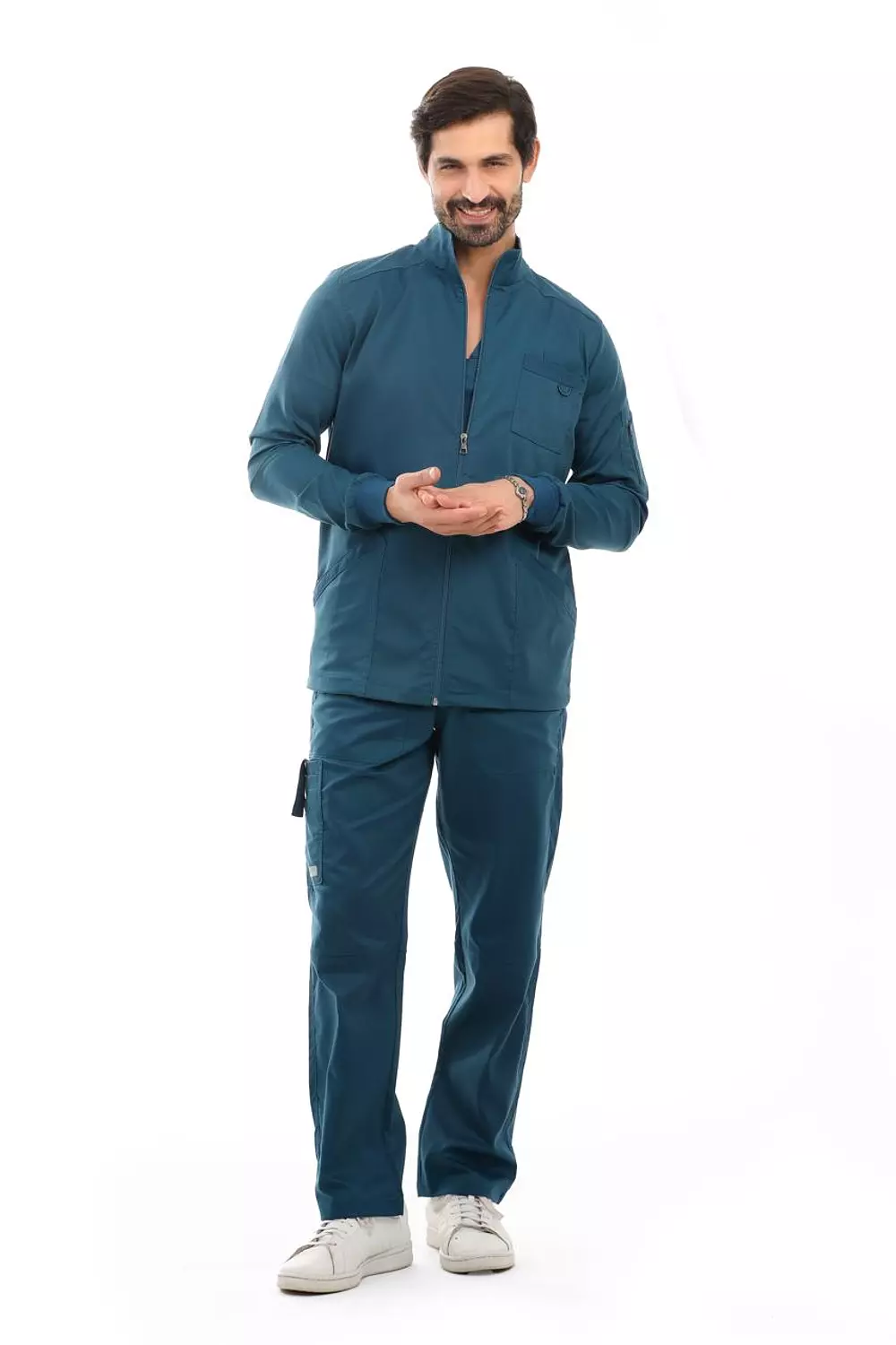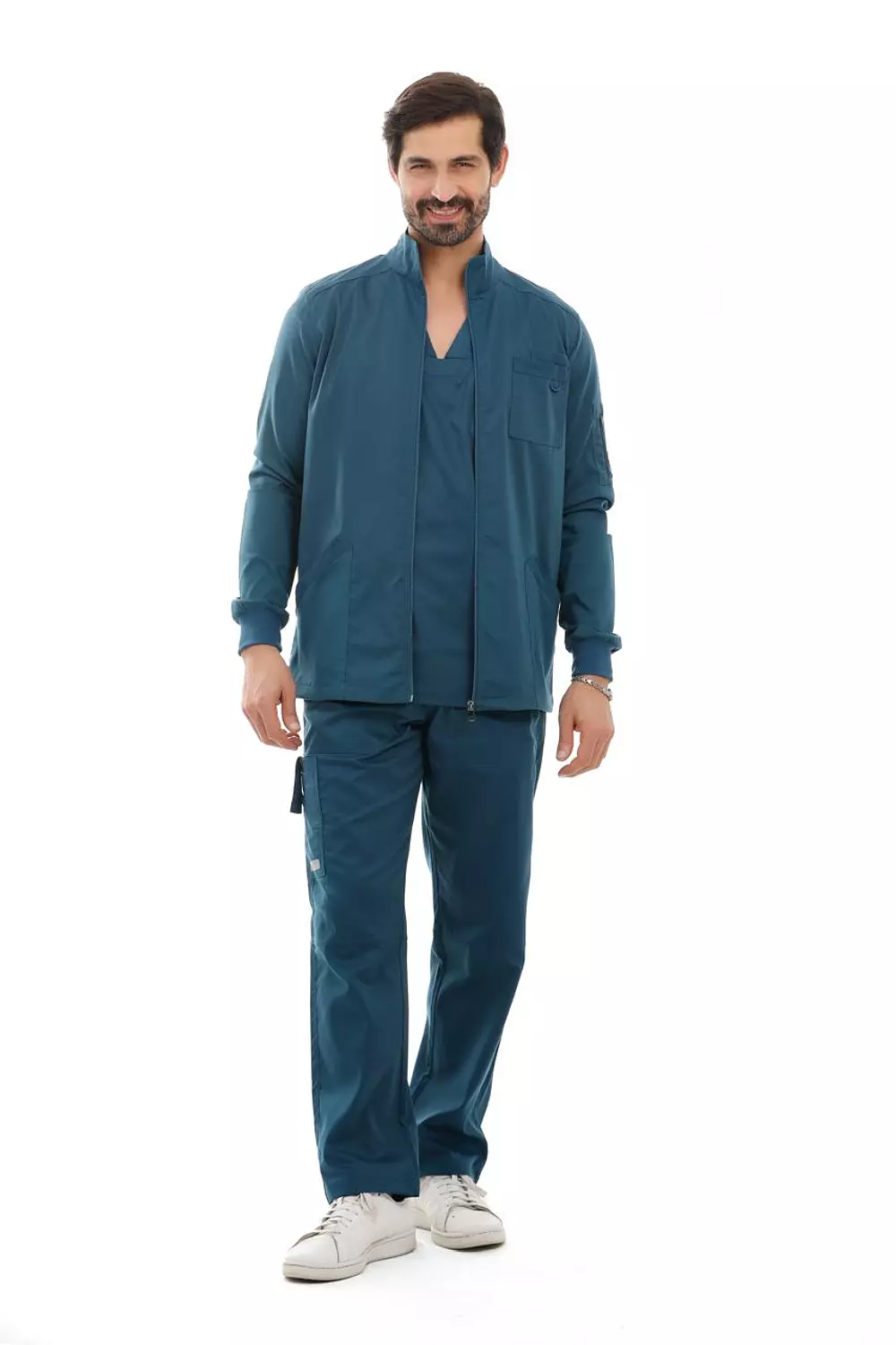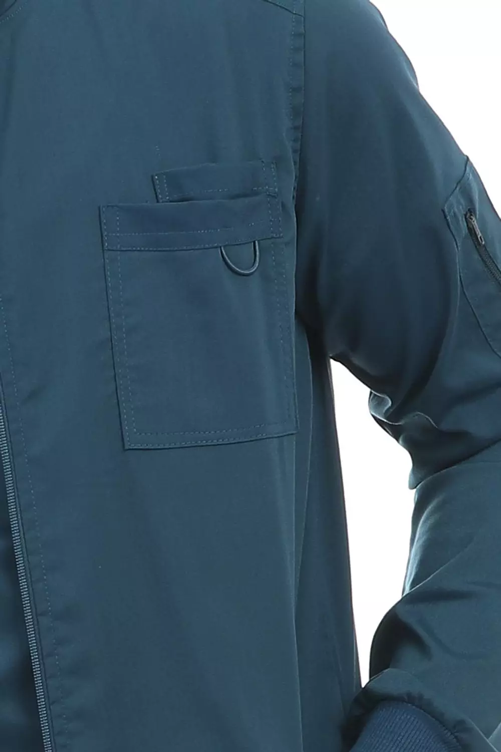 High Collar Neck jacket featuring a High Collar, long sleeves, chest front welt pocket, Front welt pockets, elastic band wrist, Shoulder welt pocket with zipper.