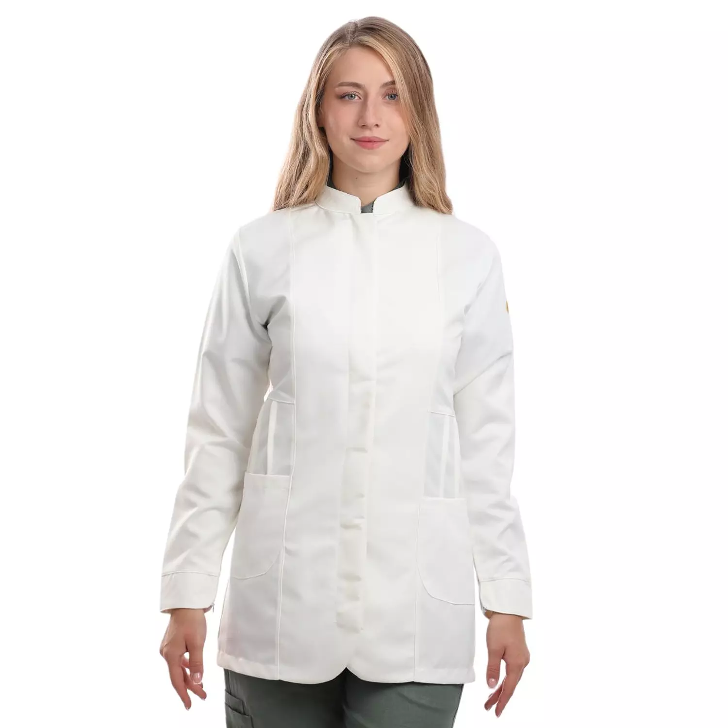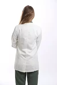 Features: Anti-Shrinkage & Anti-Wrinkle lab coat featuring half collar, long sleeves, front patch pockets, ribbed cuffs and invisible snap buttons front, hidden zipper at sleeves end.