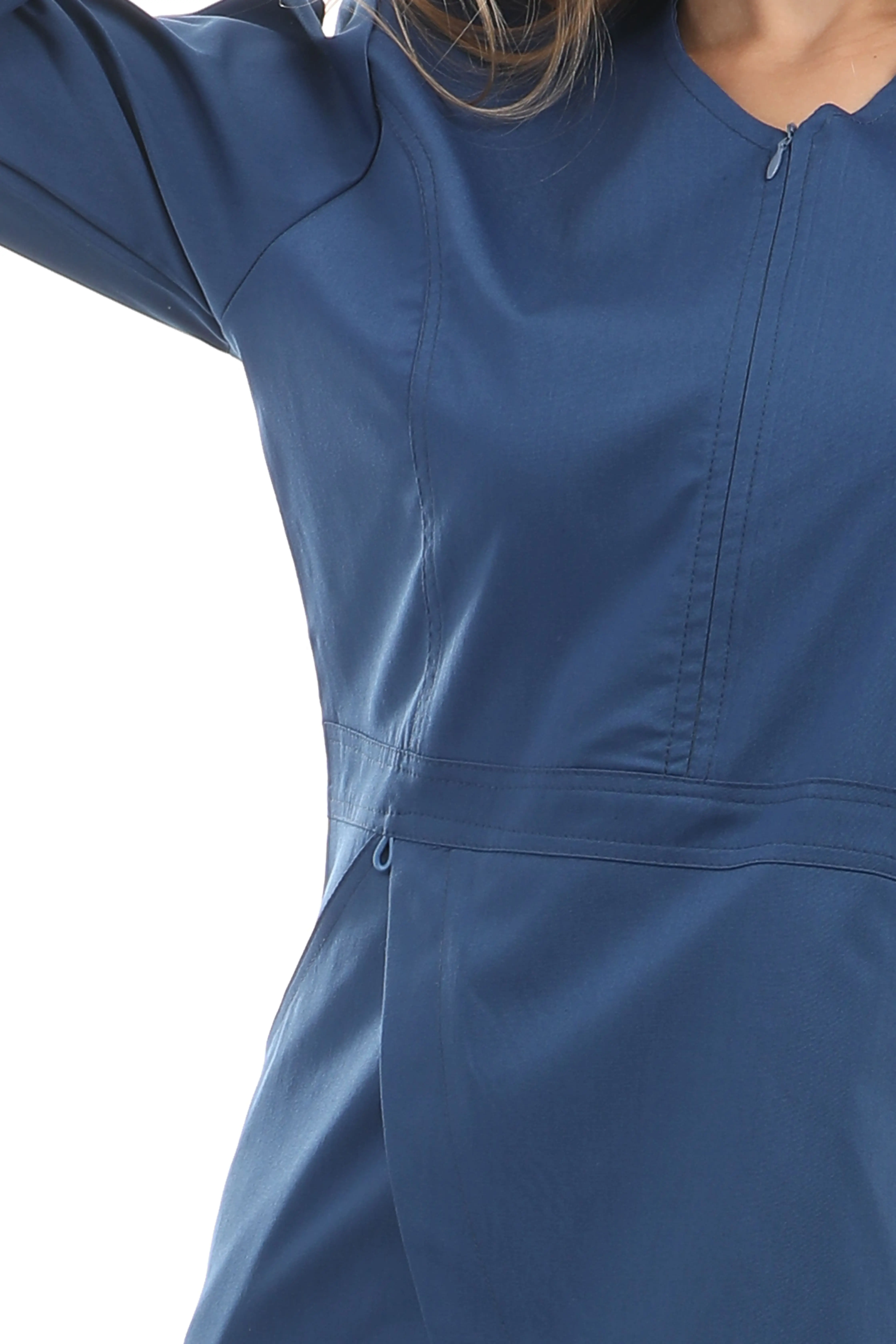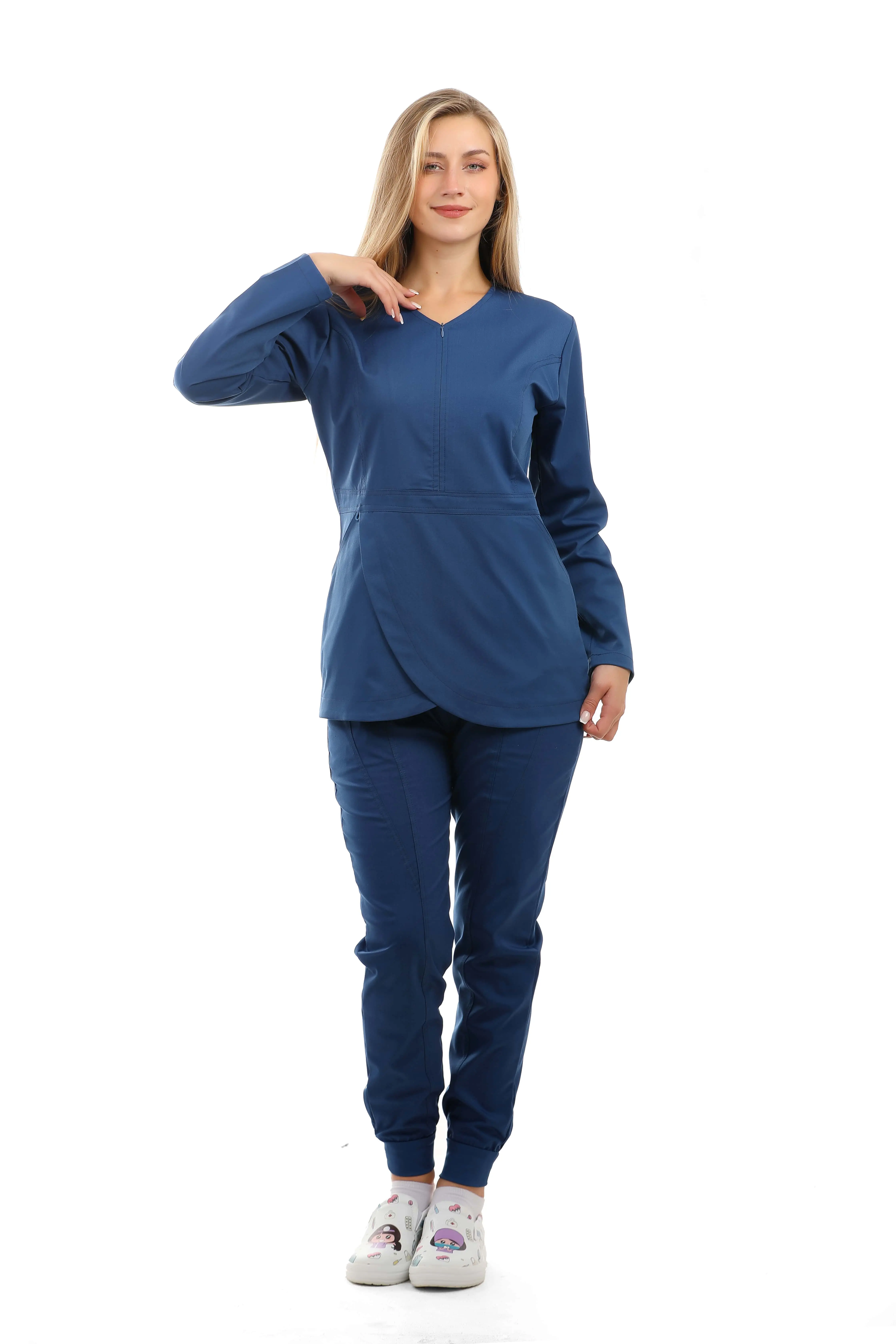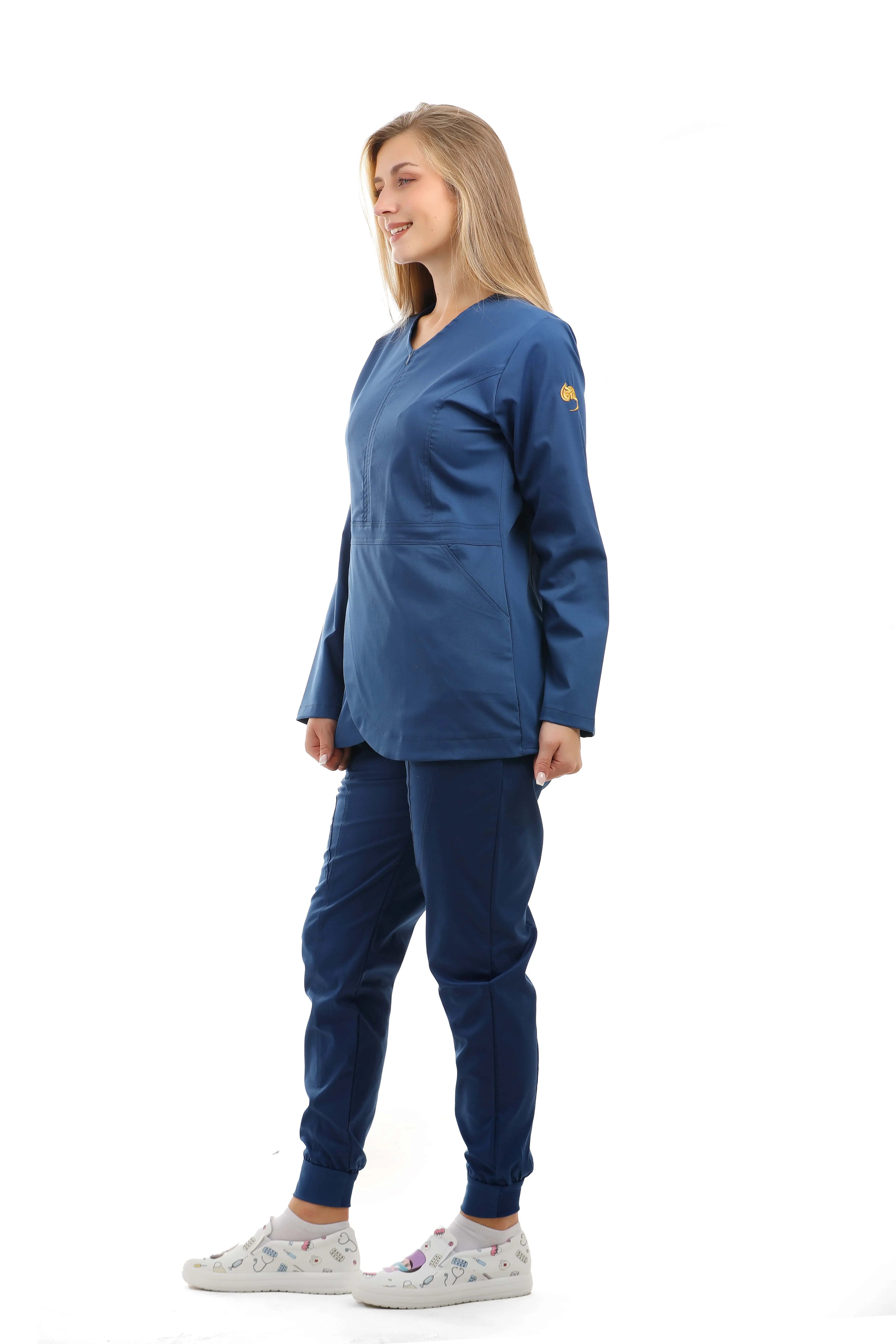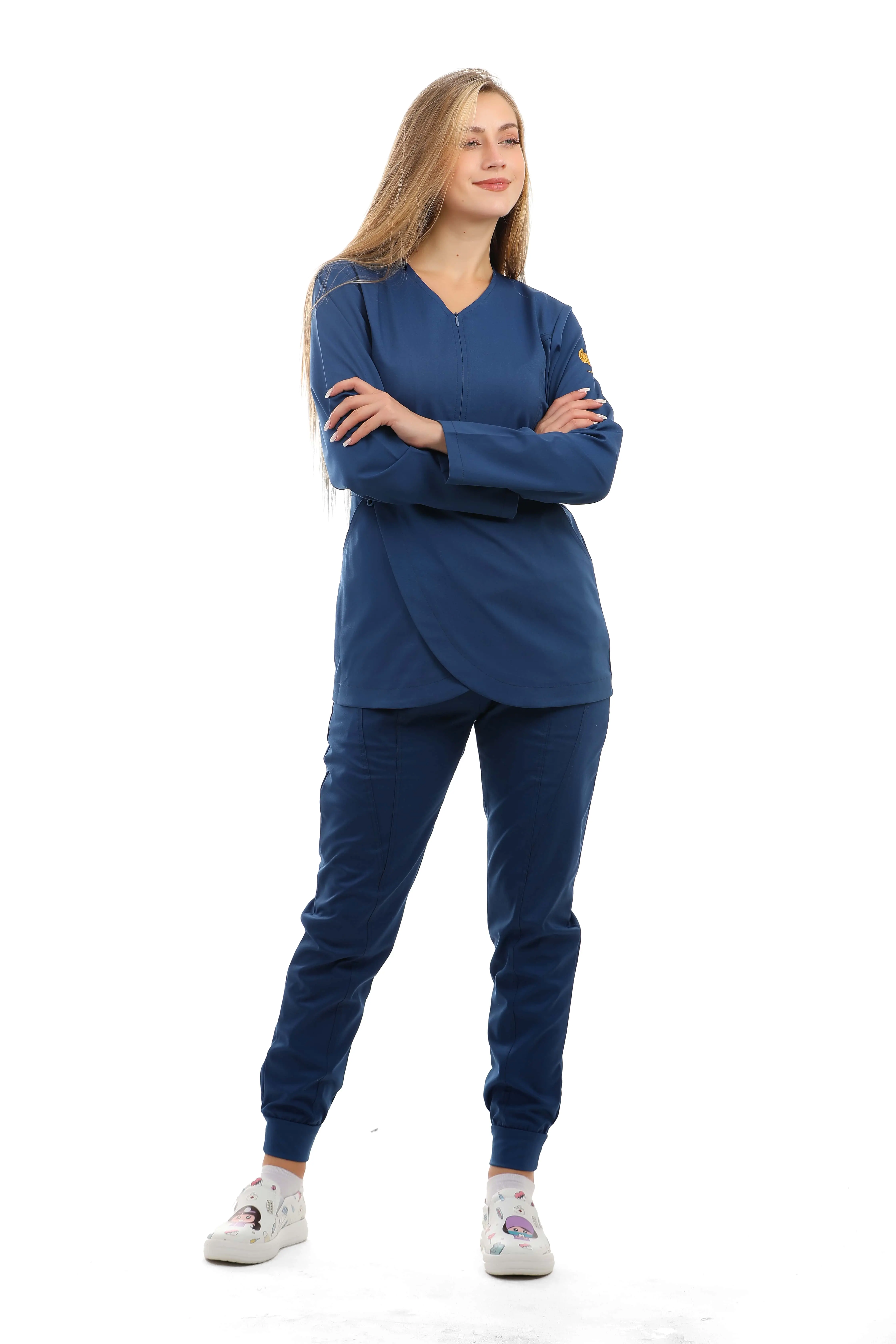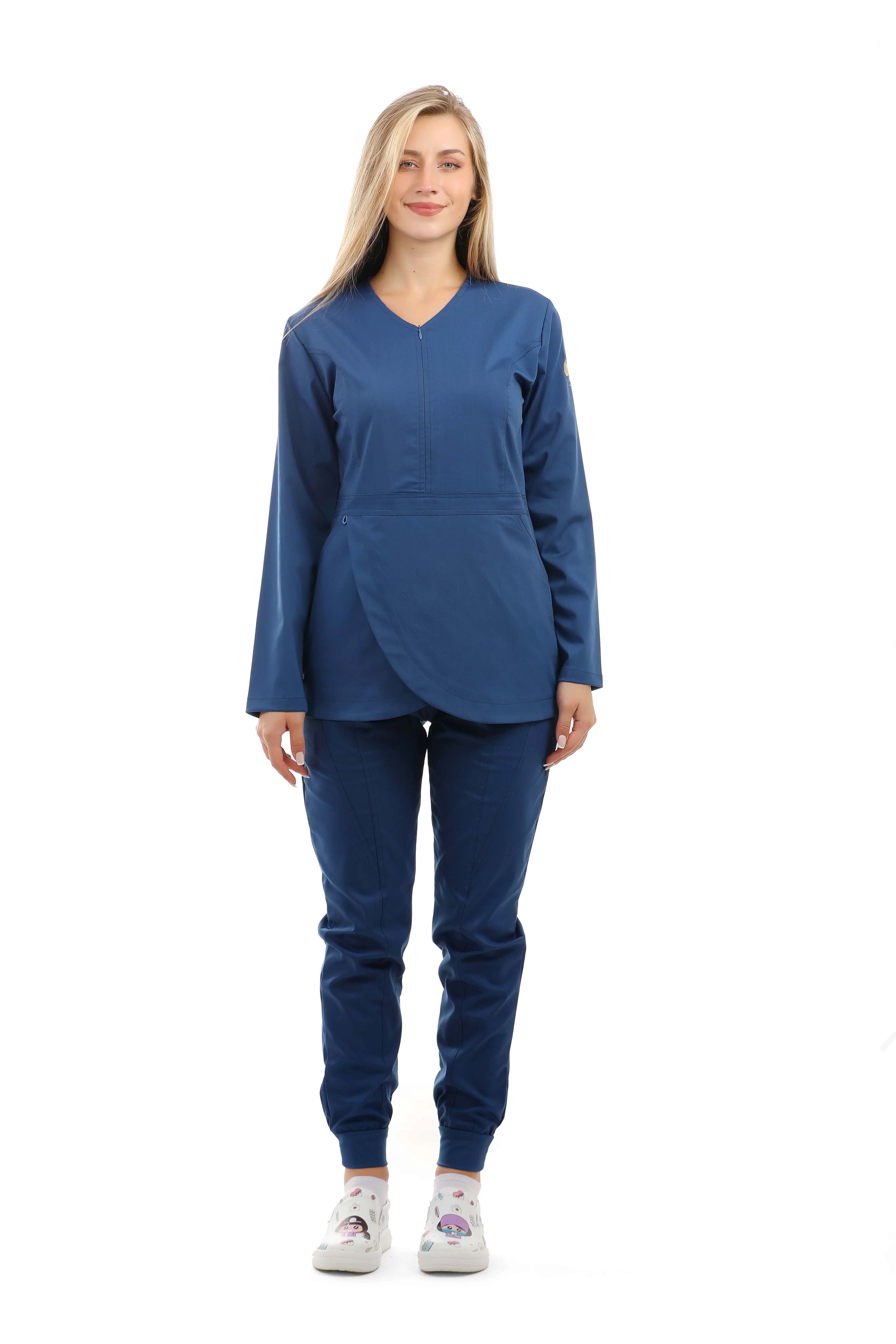 المزايا: سكراب علوي من قماش الليكرا على شكل زهرة التيوليب , جيوب امامية , سحاب على الصدر غير مرئي ,  مريح جدًا للأطباء الذين يعملون بجهد , تصميم سروال فاخر يتميز بجيبين أماميين , اساور مطاطية في القدم بشكل جمالي