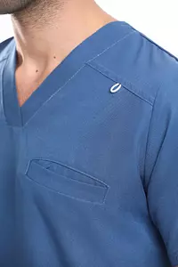 V Neck shirt featuring a V Neck, short sleeves, front welt pocket, side welt pockets, side vents at the hem.