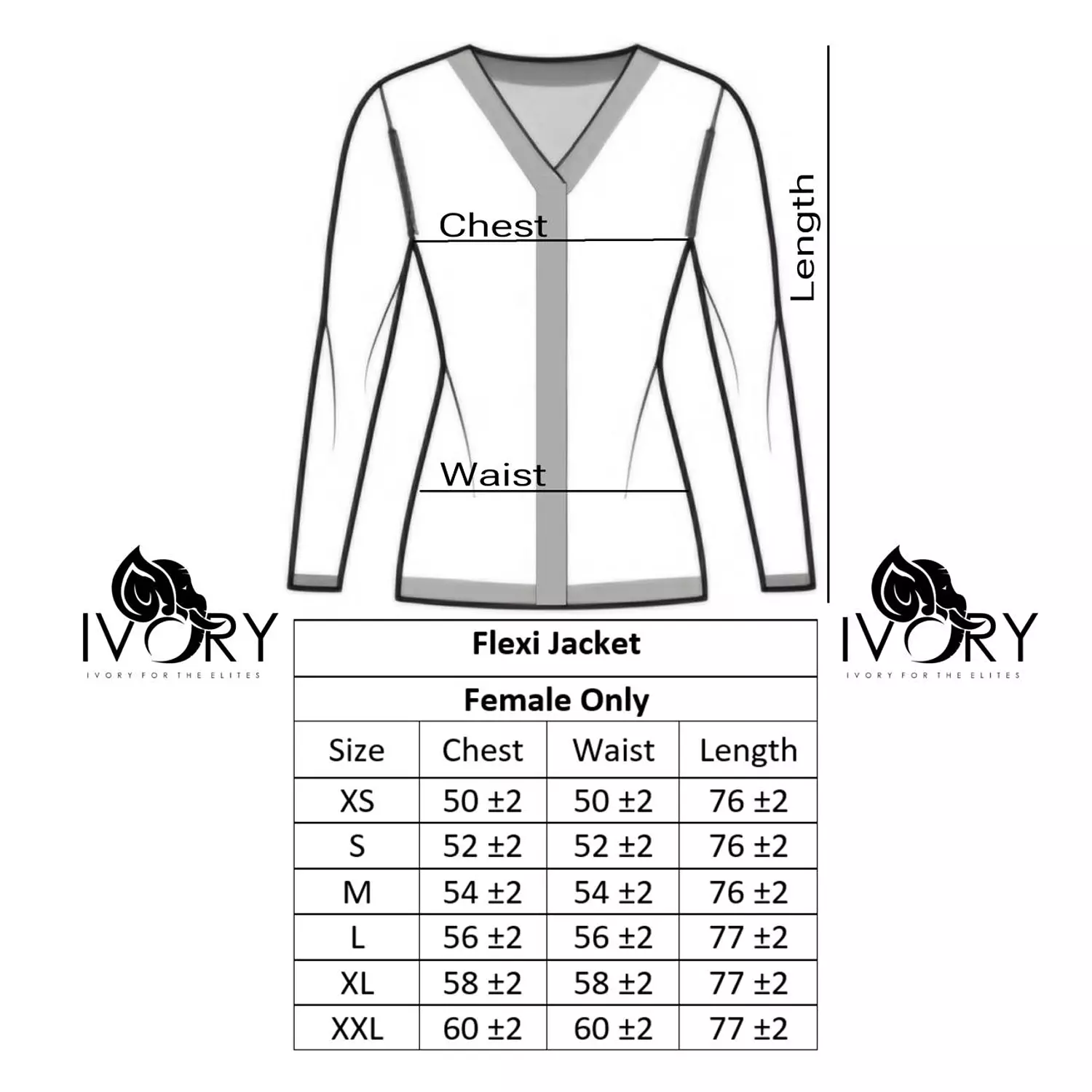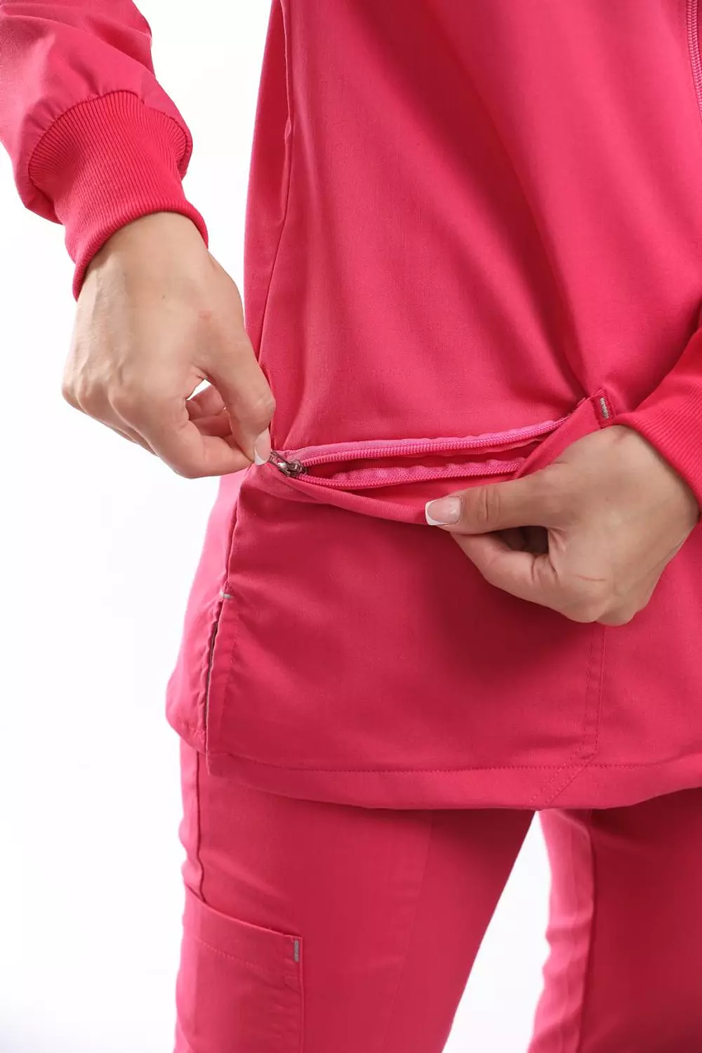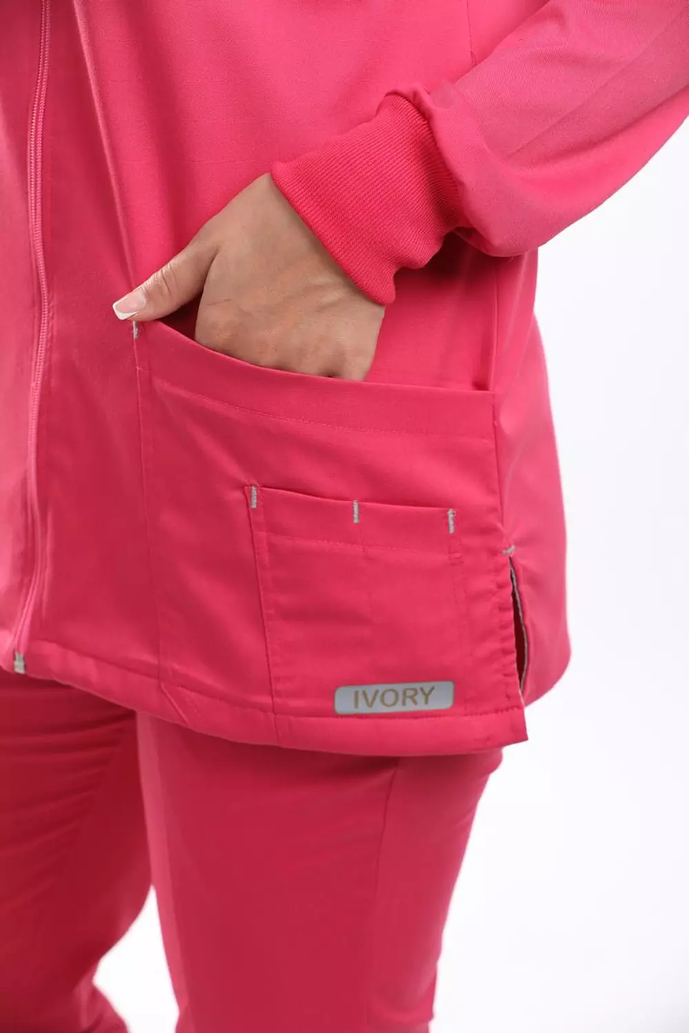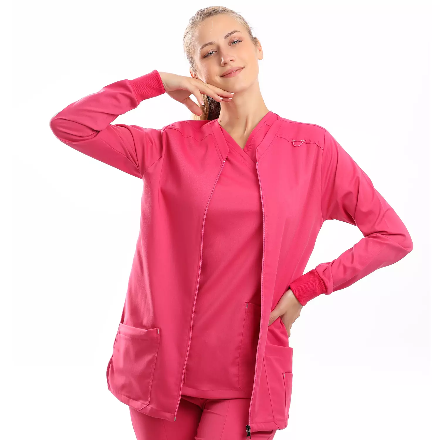 جاكيت برقبة على شكل حرف V، وأكمام طويلة، وأربعة جيوب أمامية، وفتحات جانبية عند الخصر، وشريط معصم مطاطي.