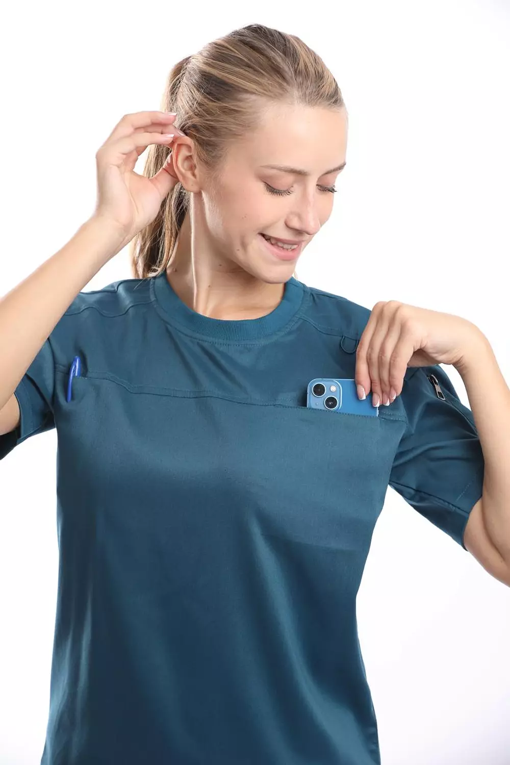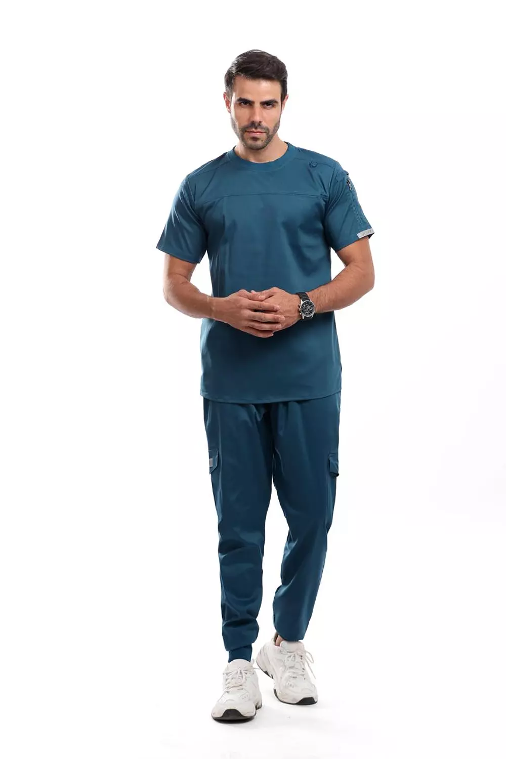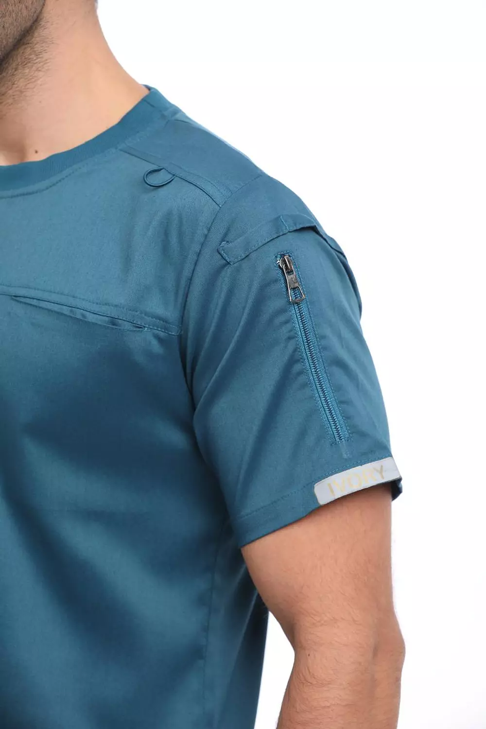 Top: Round Neck shirt featuring a Round Neck, short sleeves, two chest front welt pocket, side shoulder welt zipper pocket.