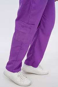 بنطلون بحزام خصر مطاطي وأربطة. جيوب أمامية، وجيب في الخلف، وجيوب جانبية عند الركبة.