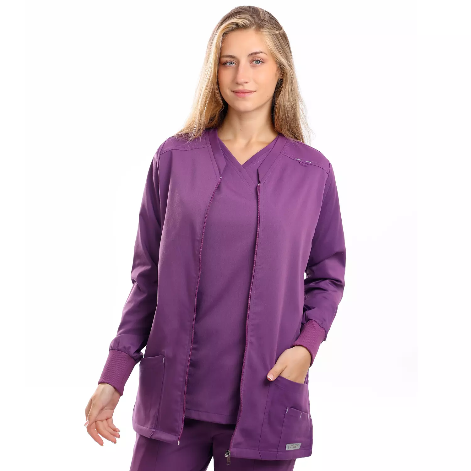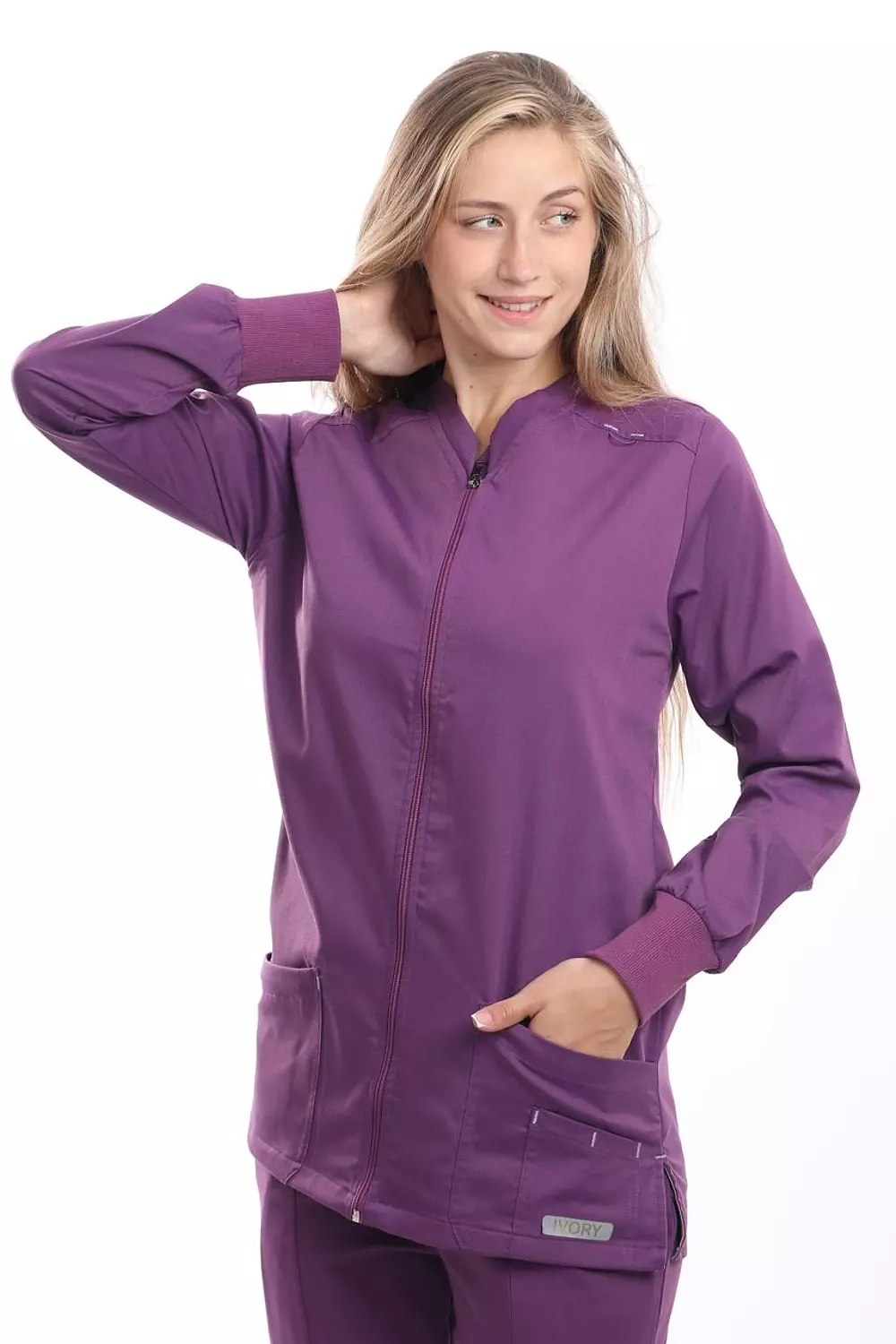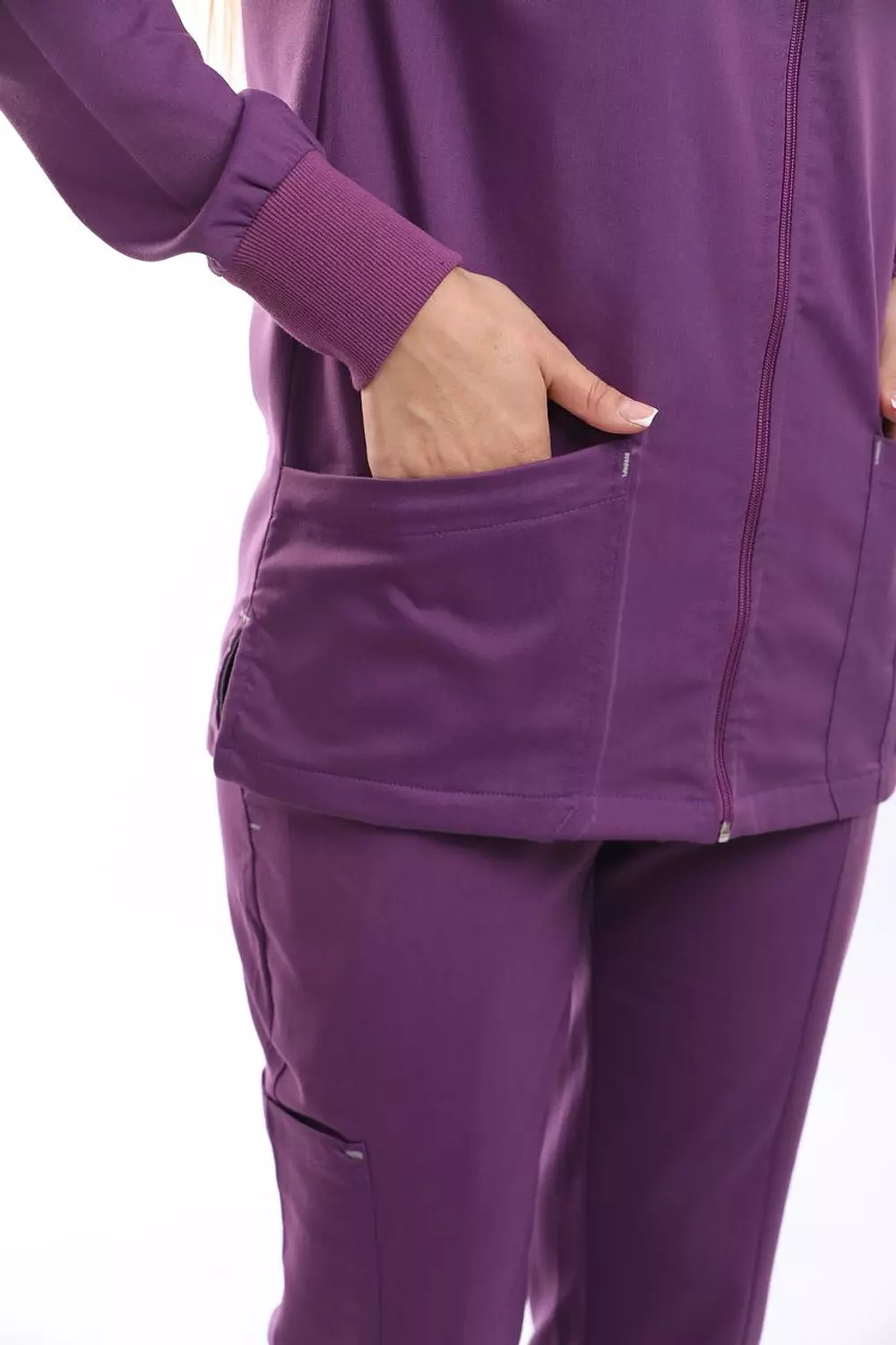 جاكيت برقبة على شكل حرف V، وأكمام طويلة، وأربعة جيوب أمامية، وفتحات جانبية عند الخصر، وشريط معصم مطاطي.