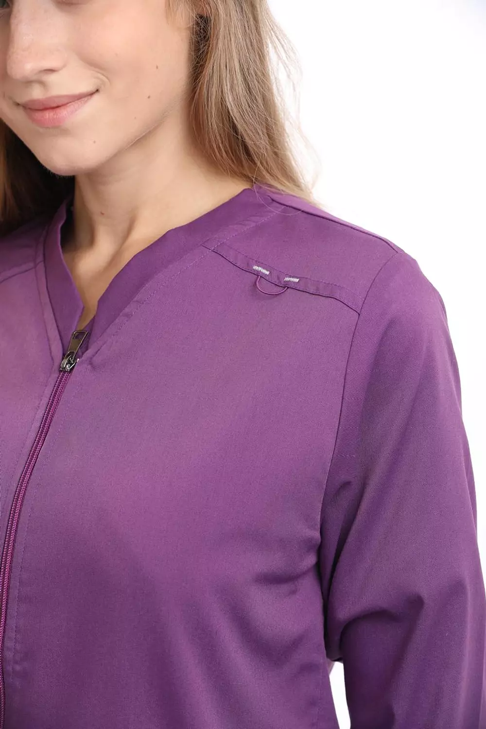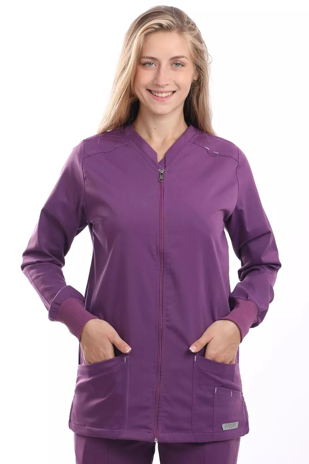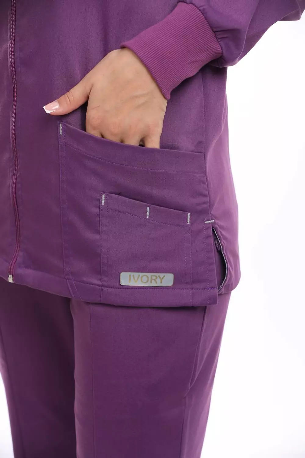 جاكيت برقبة على شكل حرف V، وأكمام طويلة، وأربعة جيوب أمامية، وفتحات جانبية عند الخصر، وشريط معصم مطاطي.