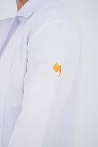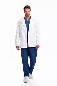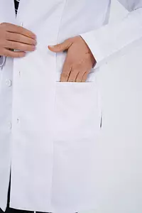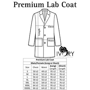 Features: Anti-Shrinkage & Anti-Wrinkle lab coat featuring Lapel collar, long sleeves, front patch pockets, side splitting, back vent at the hem.